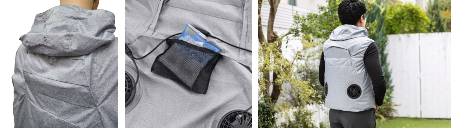 今年のモデルは、フードを使用しない時にはボタンで留められる仕様に変更し、首元にも風が通りやすくいたしました。また、背中にあるポケットに保冷剤を入れることで、ひんやりとした風を感じていただけます。