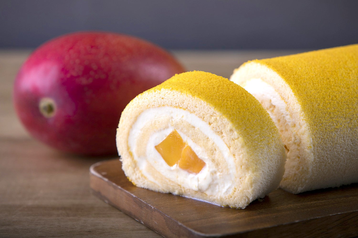 エグゼクティブ シェフ・パティシエ日吉の名を冠したロールケーキ。宮崎県産マンゴーの果肉とマスカルポーネチーズのクリームを、マンゴーパウダーで色鮮やかに仕上げたふんわり生地でロールしました。