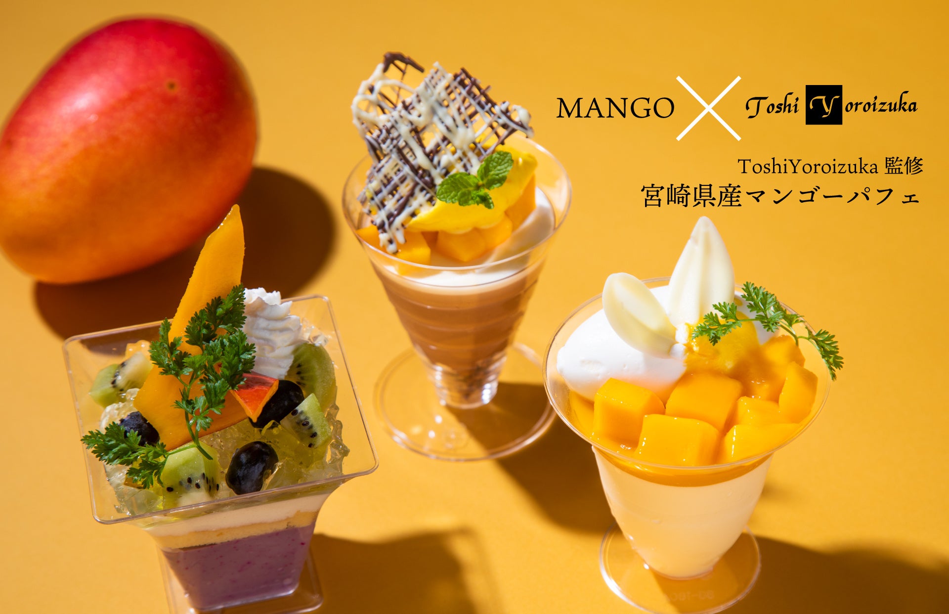 鎧塚シェフと、シェラトン・グランデ・オーシャンリゾートのエグゼクティブ シェフ・パティシエ日吉、製菓・製パン料理長の藤田が試作を重ね、完成した宮崎県産マンゴーのミニパフェ3種。イートインはもちろん、テイクアウトも可能です。