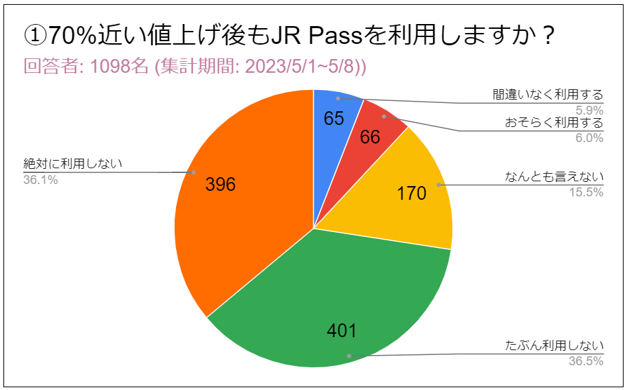 ②のアンケートでは回答者の6割近くがJR Passを利用していたと回答しており、JR Passがいかに訪日外国人旅行者に親しまれてきたかが察せられる内容となっています。これに対して①のアンケートでは、回答者の7割以上が料金改定後はJR Passを利用しないという意向を示しました。