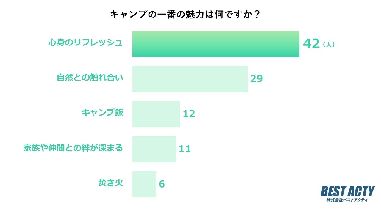 キャンプの魅力について100名にアンケートを行ったところ、「心身のリフレッシュ」と回答する人が最も多い結果となりました。