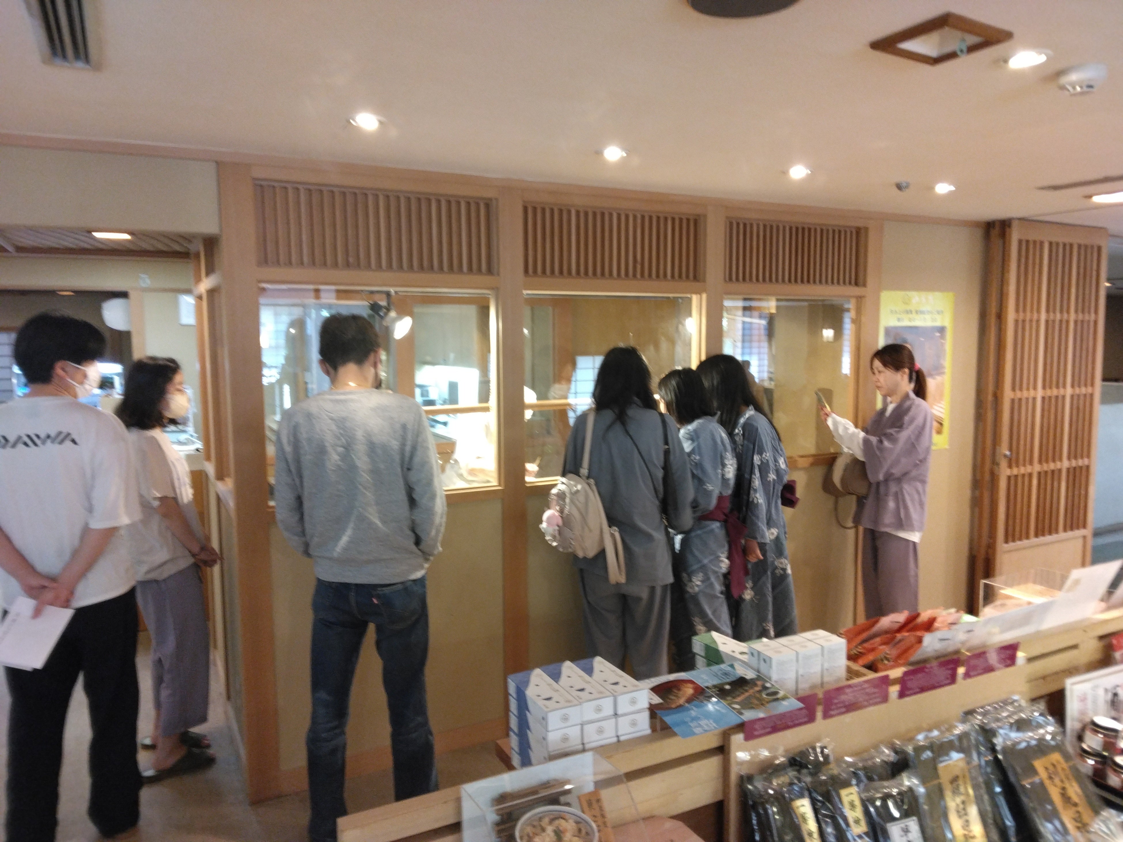 かねてよりお客様より実演観覧スペースの拡大をご要望されており、この度、売店内レイアウト変更に伴い、実演観覧スペースを拡げ、これまで以上に身近にゆば引き上げ実演風景をお楽しみいただけるようになりました。