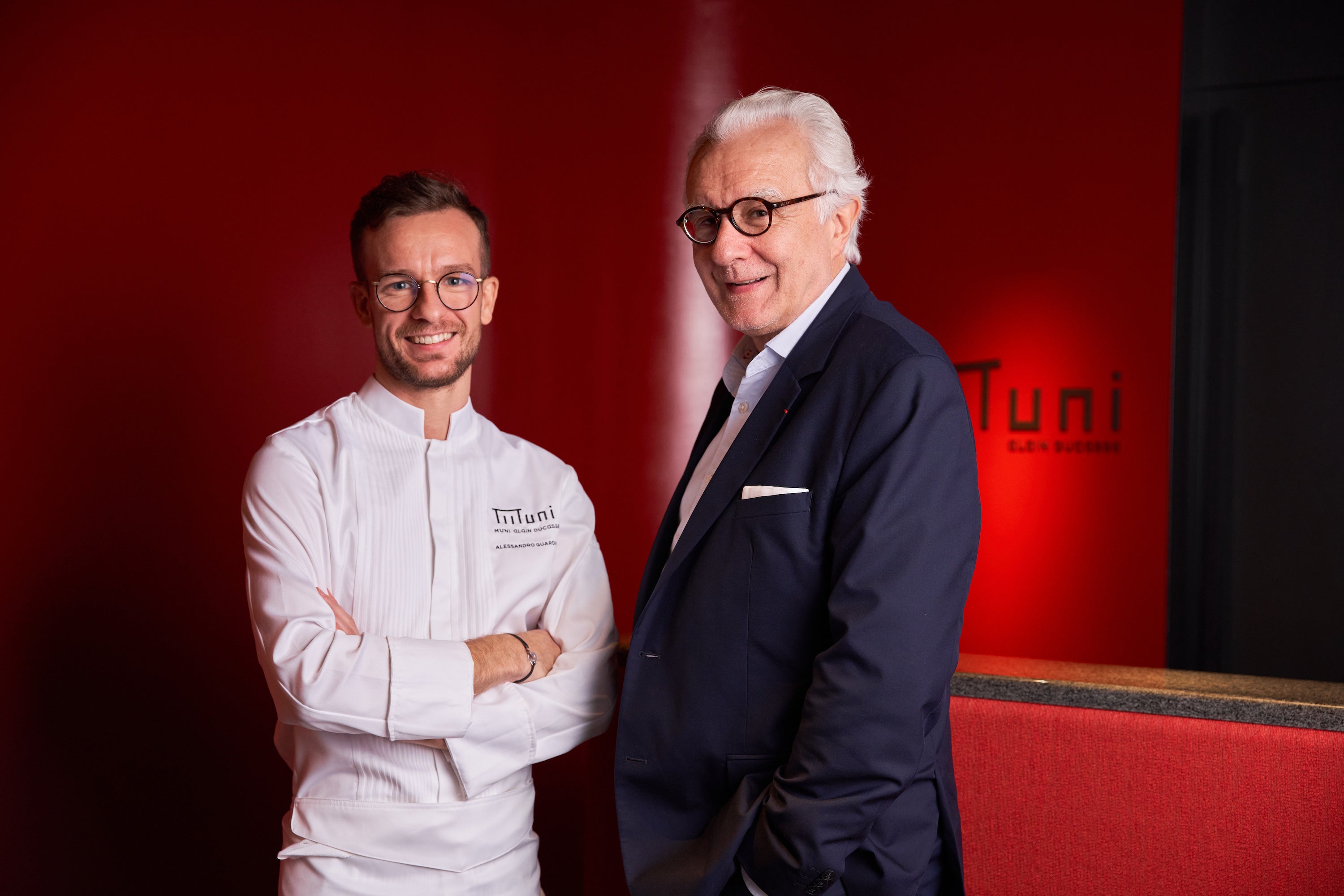 写真左から「MUNI ALAIN DUCASSE」エグゼクティブシェフ アレッサンドロ・ガルディアーニ、アラン・デュカス氏