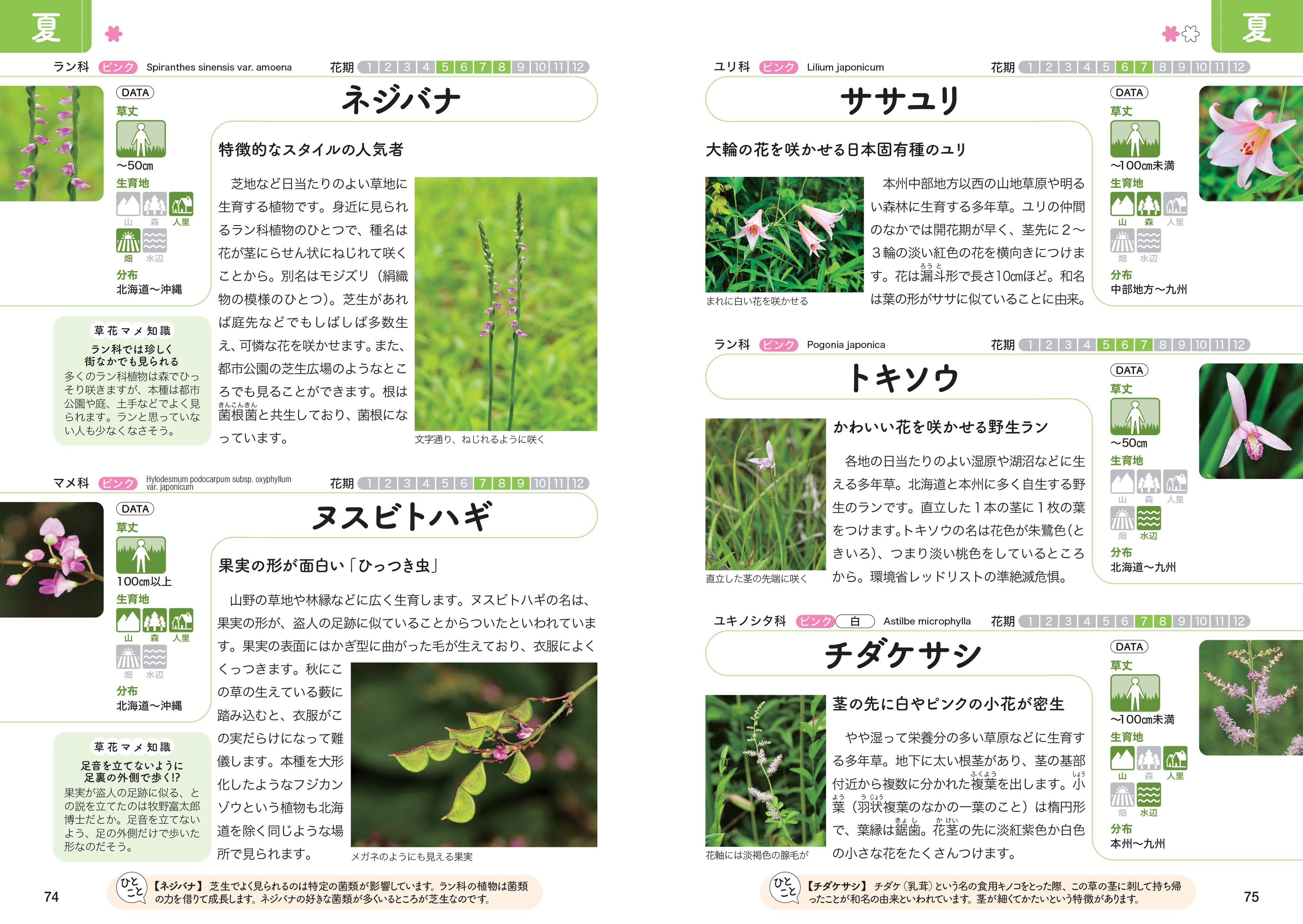 ふだんよく目にしていても、初心者には識別は難しいもの。「よく見る草花だけど、これ何だっけ…?」をしっかりサポートする図鑑が誕生しました。街なかや公園、河川敷や線路の近く、森や林など、近所を歩いて見かける代表的な草花約400種を、季節や花の色、草丈で分類して、全写真オールカラーで掲載。名前の由来は?虫と花は助け合いながら生きている?などのコラムで興味も深まります。