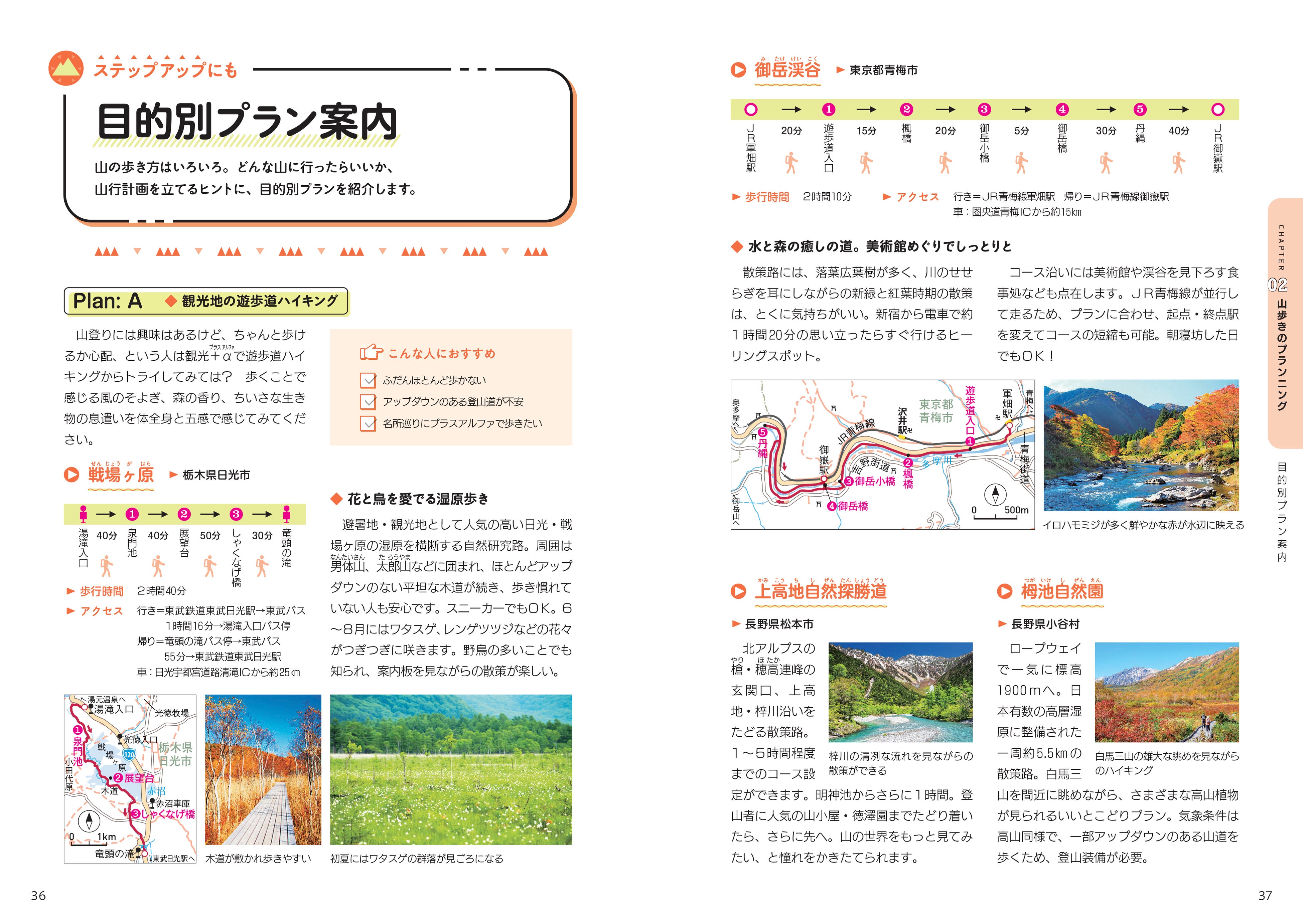 これから山歩きをはじめる人が最初にもつ疑問「だれと行こう?」「どの山へ登ろう?」「何を持って行こう?」を解決する、山歩きに必要な知識を紹介。また、そろえておきたい山ウエアや道具のほか、組み合わせの参考になるコーディネートページも!疲れない山の歩き方やカミナリ対処法など、本当に知りたい&役立つ知識をおさえておくことができます。