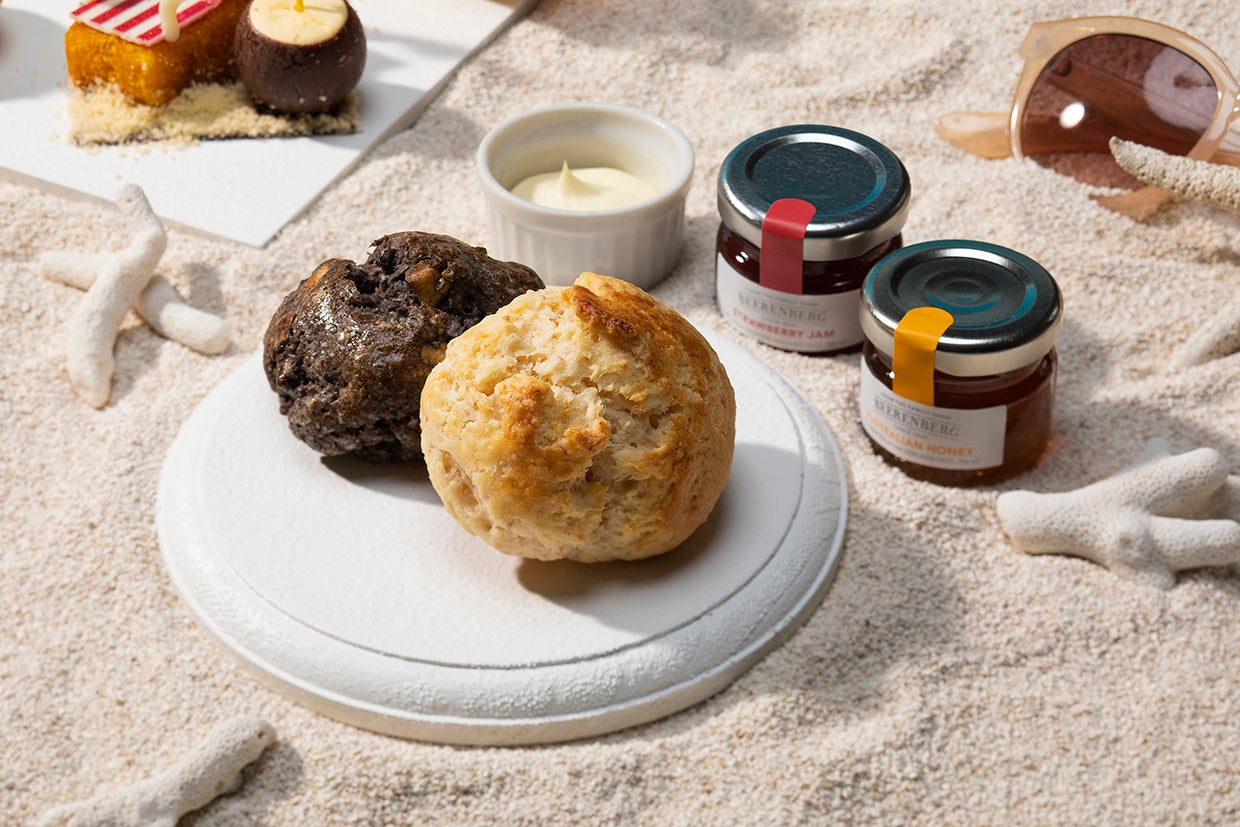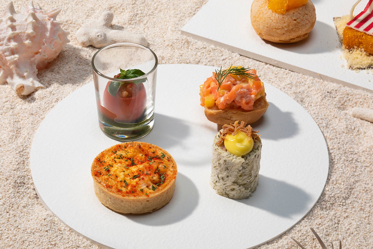 スイーツには瑞々しいフルーツを使用した「白桃のコンポートジュレ」や甘みと酸味がマッチしたムースの浮き輪が可愛らしい「パイナップルとヨーグルトムース」、パッションフルーツの爽やかなパウンドケーキにチョコレートでビーチチェアをイメージした「パッションフルーツパウンドケーキ」、帽子に見立てたメレンゲがデザインされた酸味の効いた「カラマンシーマシュマロ」など、初夏の爽やかな味わいのラインアップでお届けいたします。セイヴォリーメニューには、スパイシーなカレー風味の「ソーセージとカレーキャベツの海藻パンのサンドイッチ」や、魚介の旨味を利かせた「シーフードのキッシュ」、彩り豊かな夏野菜たっぷりの「トマト、ラタトゥイユ、バジル」など夏の気分を盛り上げる4種をご用意いたしました。