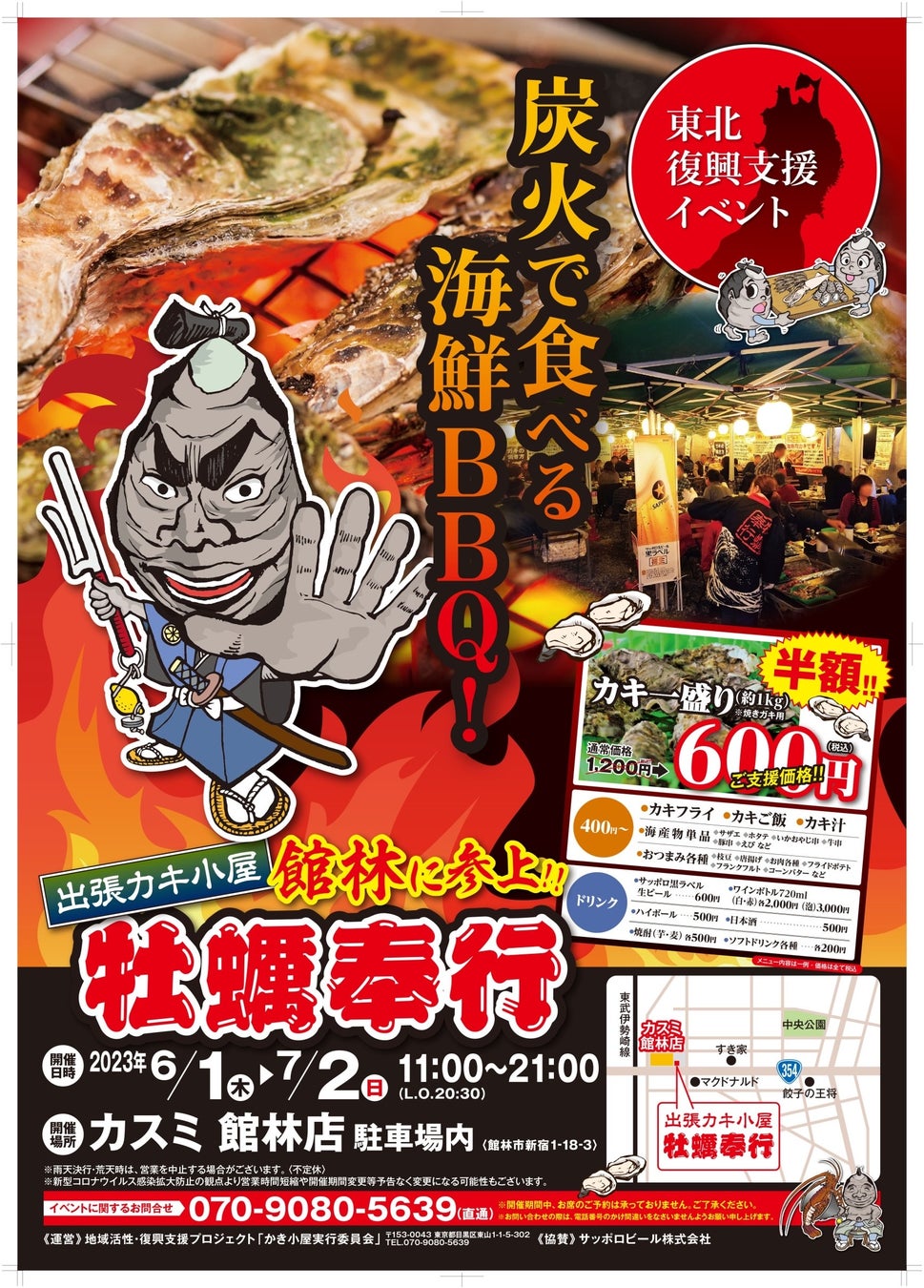 「出張カキ小屋 牡蠣奉行がカスミ館林店駐車場内に期間限定オープン。期間は6月1日〜7月2日まで。
