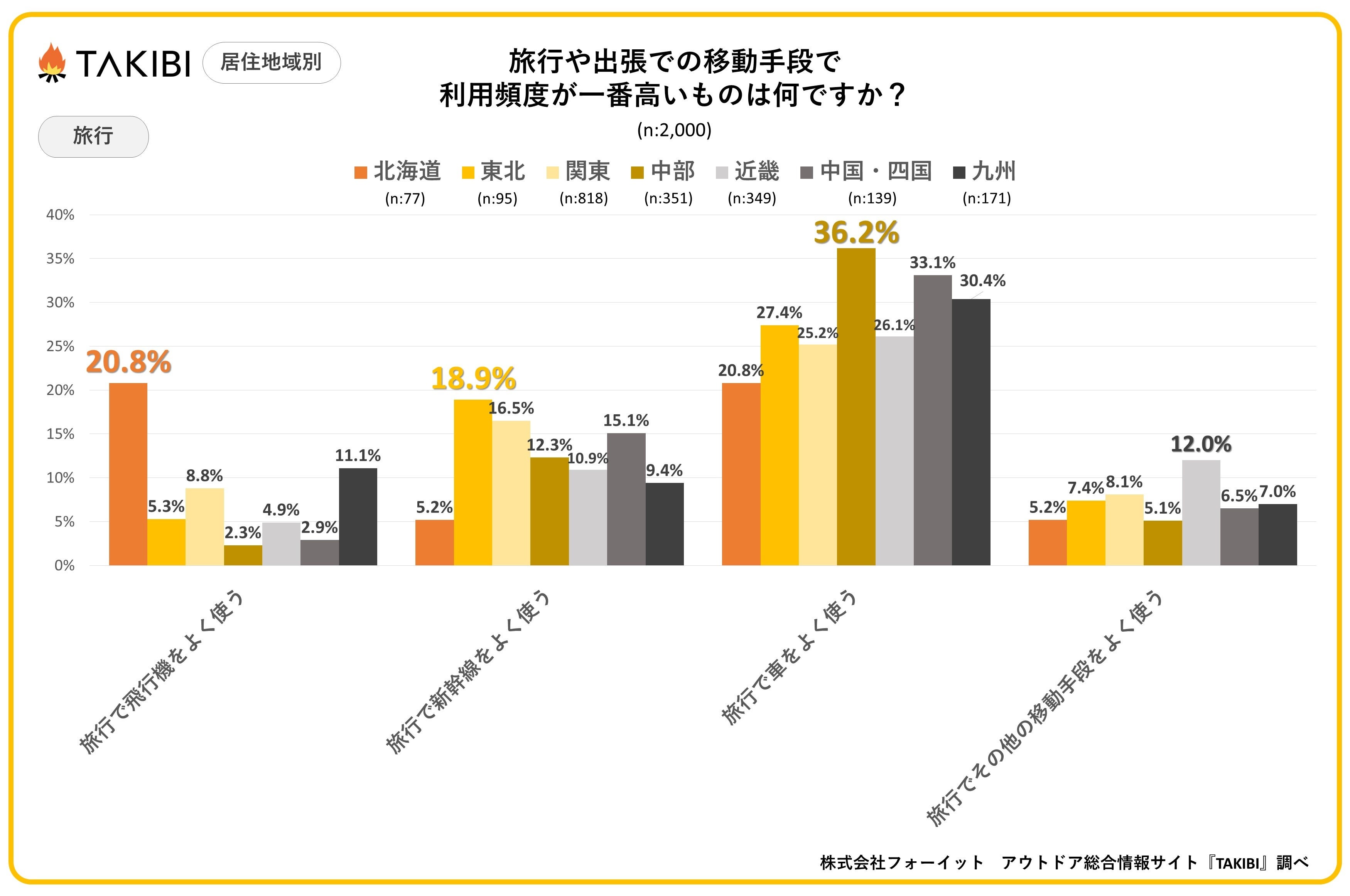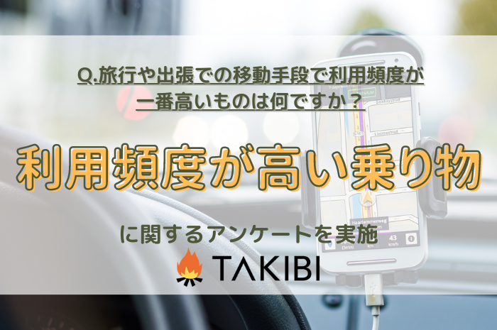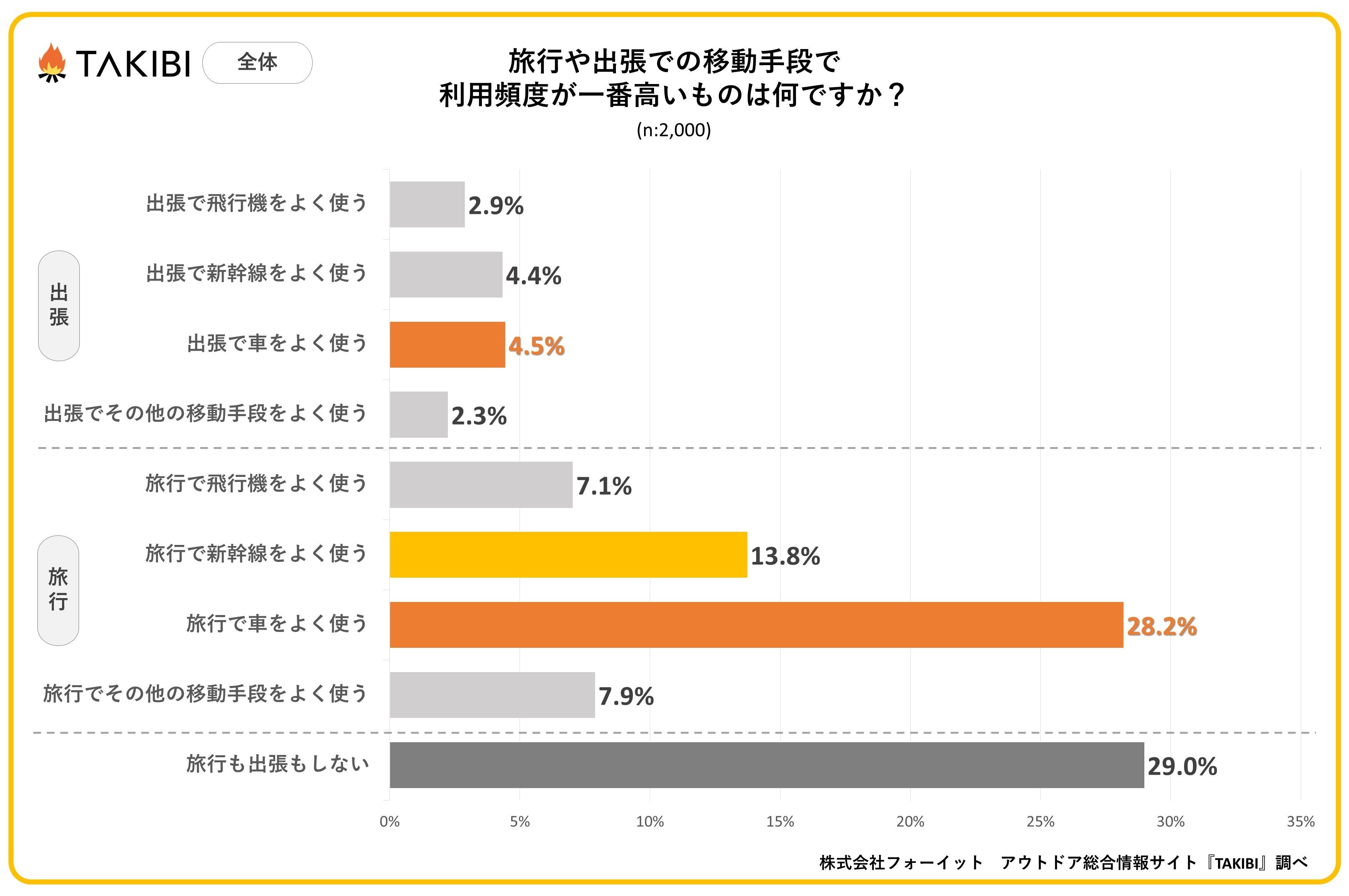 キャンプやグランピングを中心としたアウトドア総合情報サイト「TAKIBI」の運営をおこなう株式会社フォーイットは、全国の10代~50代までの男女2,000人を対象に利用頻度が高い乗り物に関するアンケートを実施し、男女別・年代別等の特徴についてまとめました。