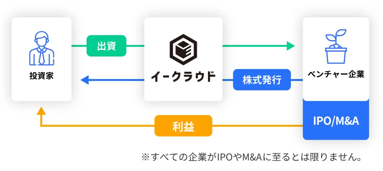 イークラウドは、インターネットを通じて非上場のスタートアップが個人投資家から資金を調達する仕組み「株式投資型クラウドファンディング」を提供しています。