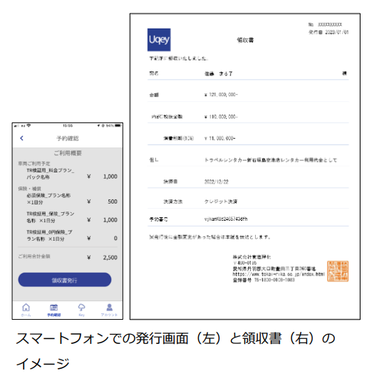レンタカーの利用料金もしくはキャンセル料金の領収書を発行する機能を追加しました。今までは領収書が必要な際は店舗の窓口へ行く必要がありましたが、本機能が追加されることで、利用者はスマートフォンのアプリ1つで領収書の発行ができます。また、PCからも領収書の発行が可能です。