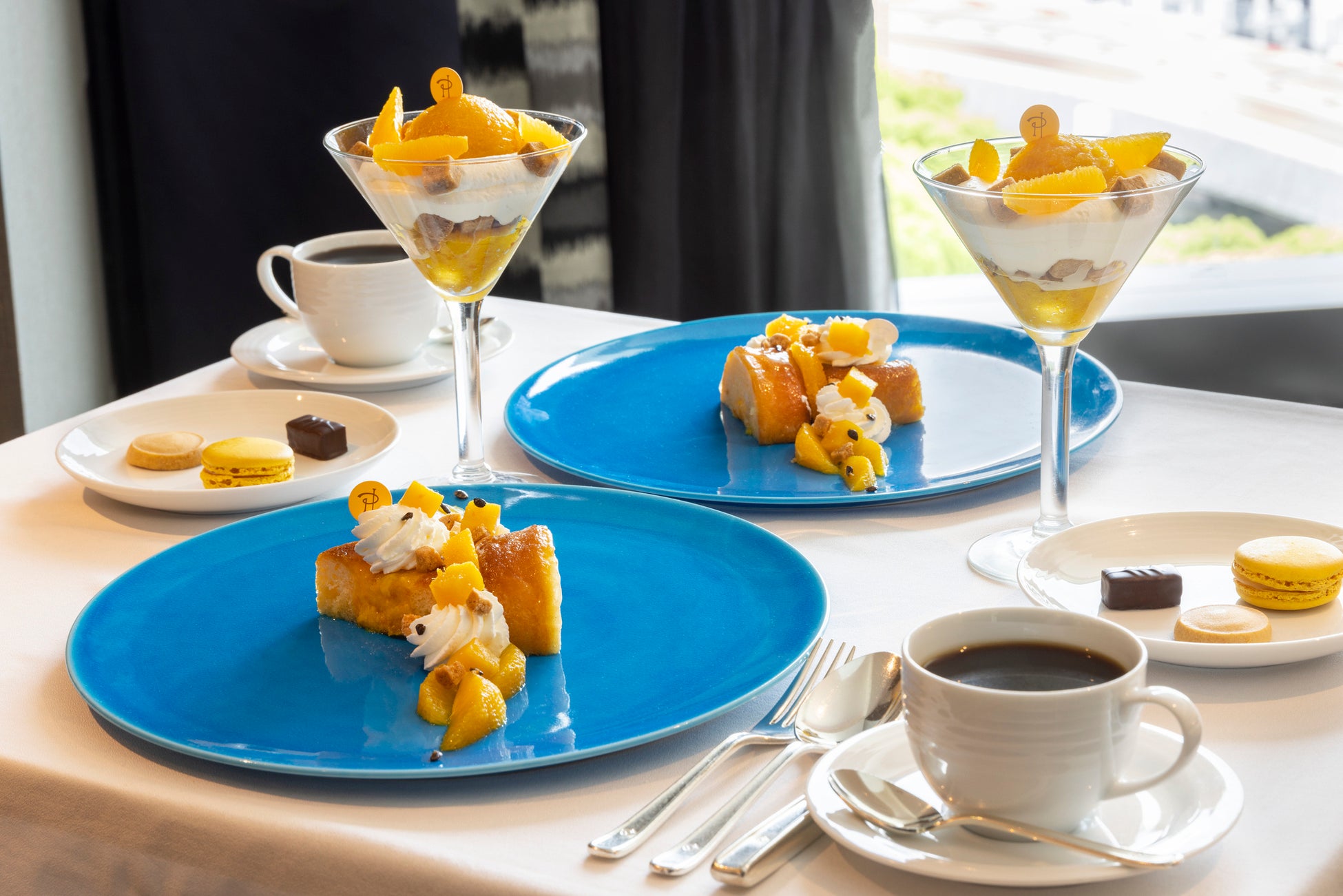 鮮やかなブルーのお皿に黄金色のスイーツのコントラストが夏らしく映えるスイーツセットは、カップルや、女子旅、母娘の夏旅といった大切な方との思い出作りに華を添えること間違いなし!