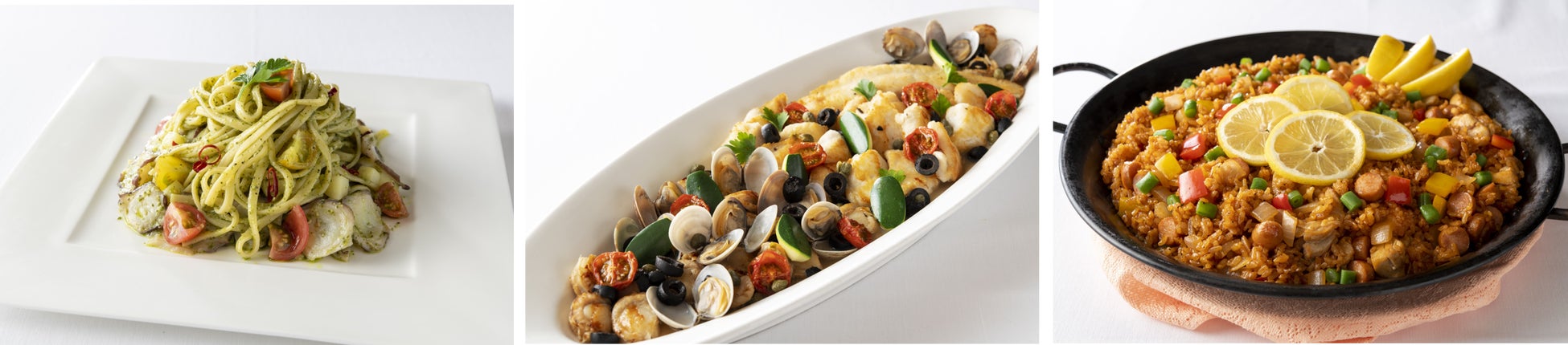 タコとセロリの冷製ジェノベーゼパスタ / 白身魚のアクアパッツア / ジャンバラヤ