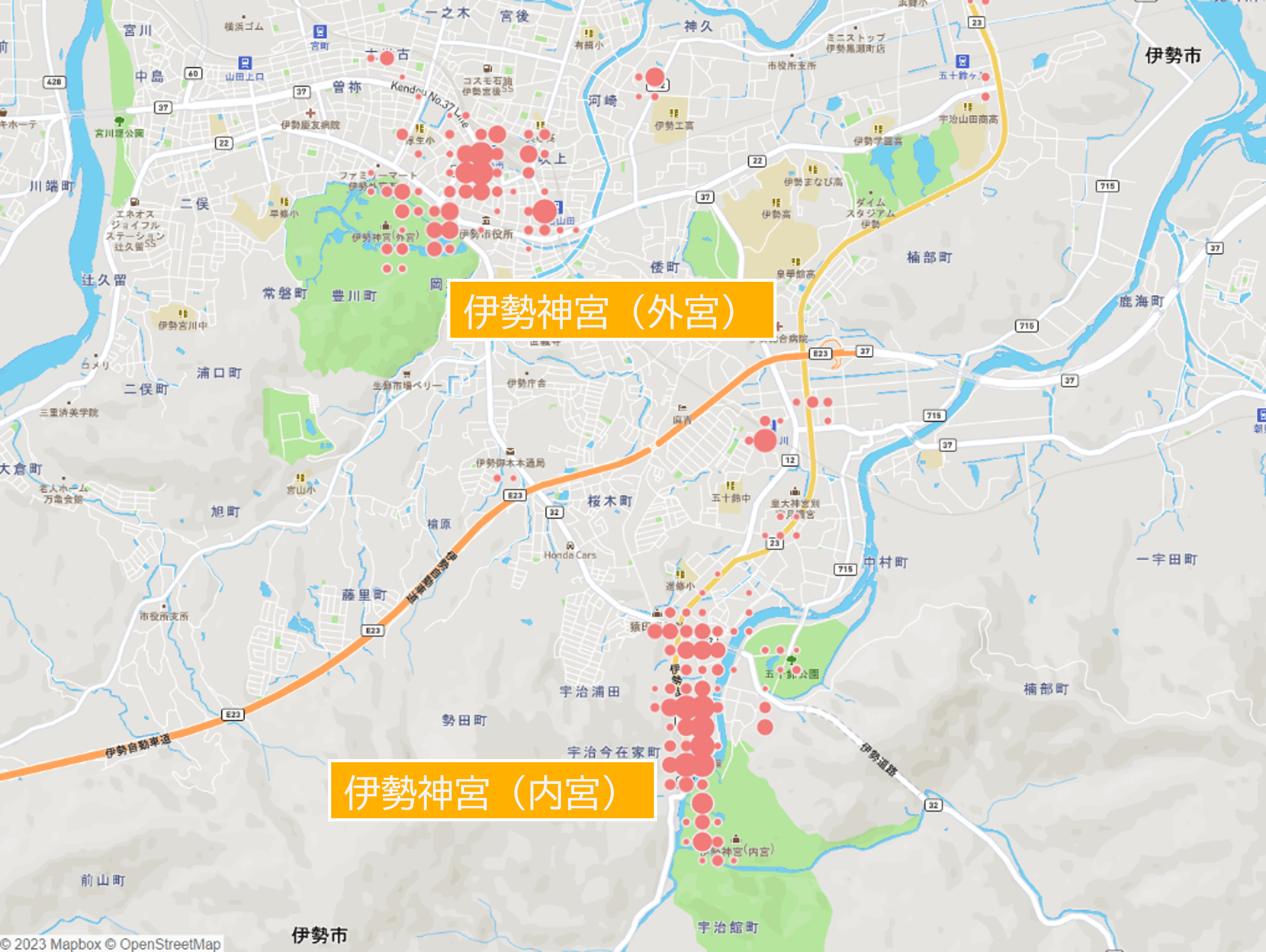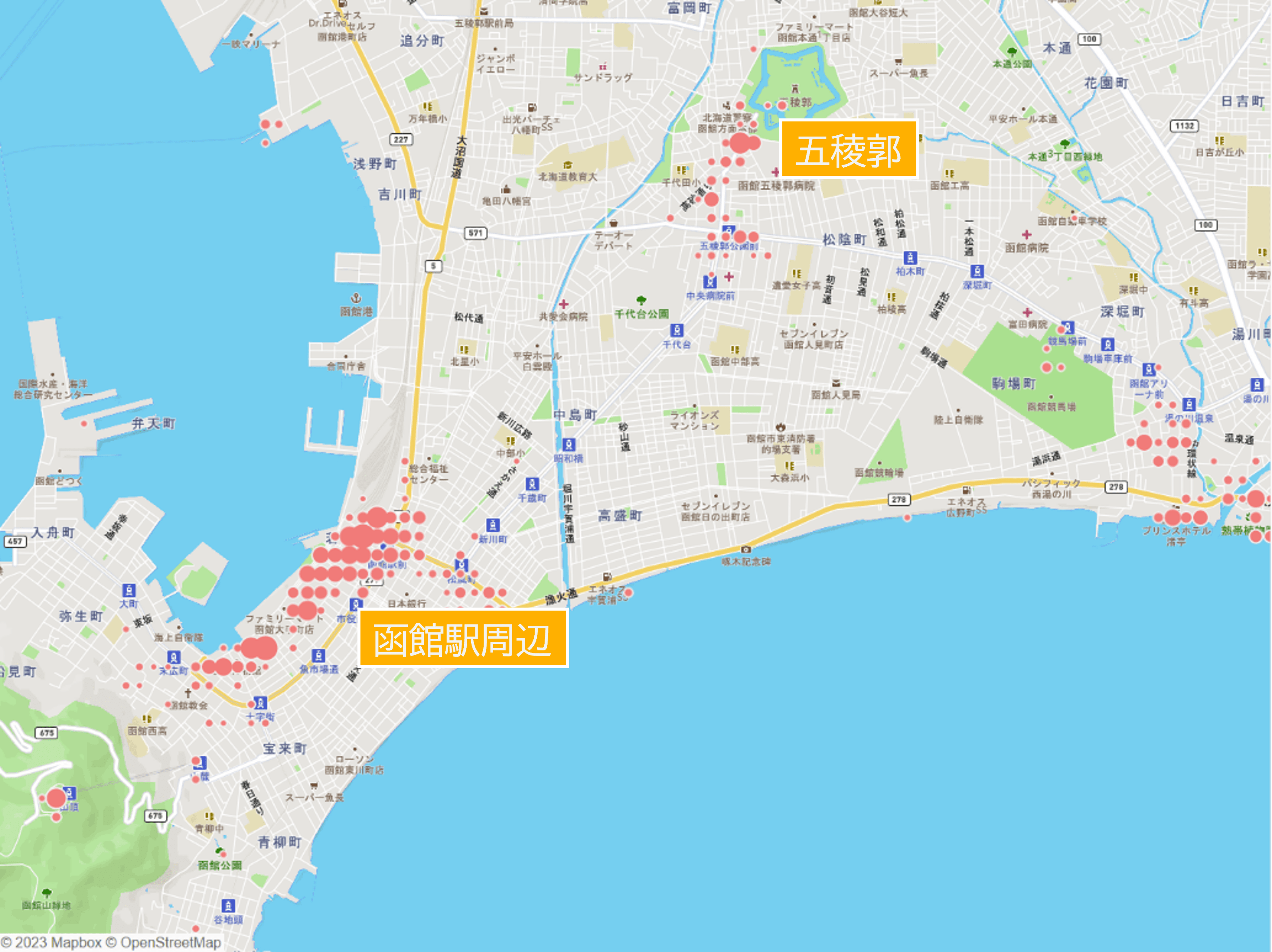 観光スポットもしくは宿泊エリアのみに点が現れており、上記以外の観光地と照らし合わせてもプロットされているため、おおむね点は、旅行客を捉えていると考えられます。
