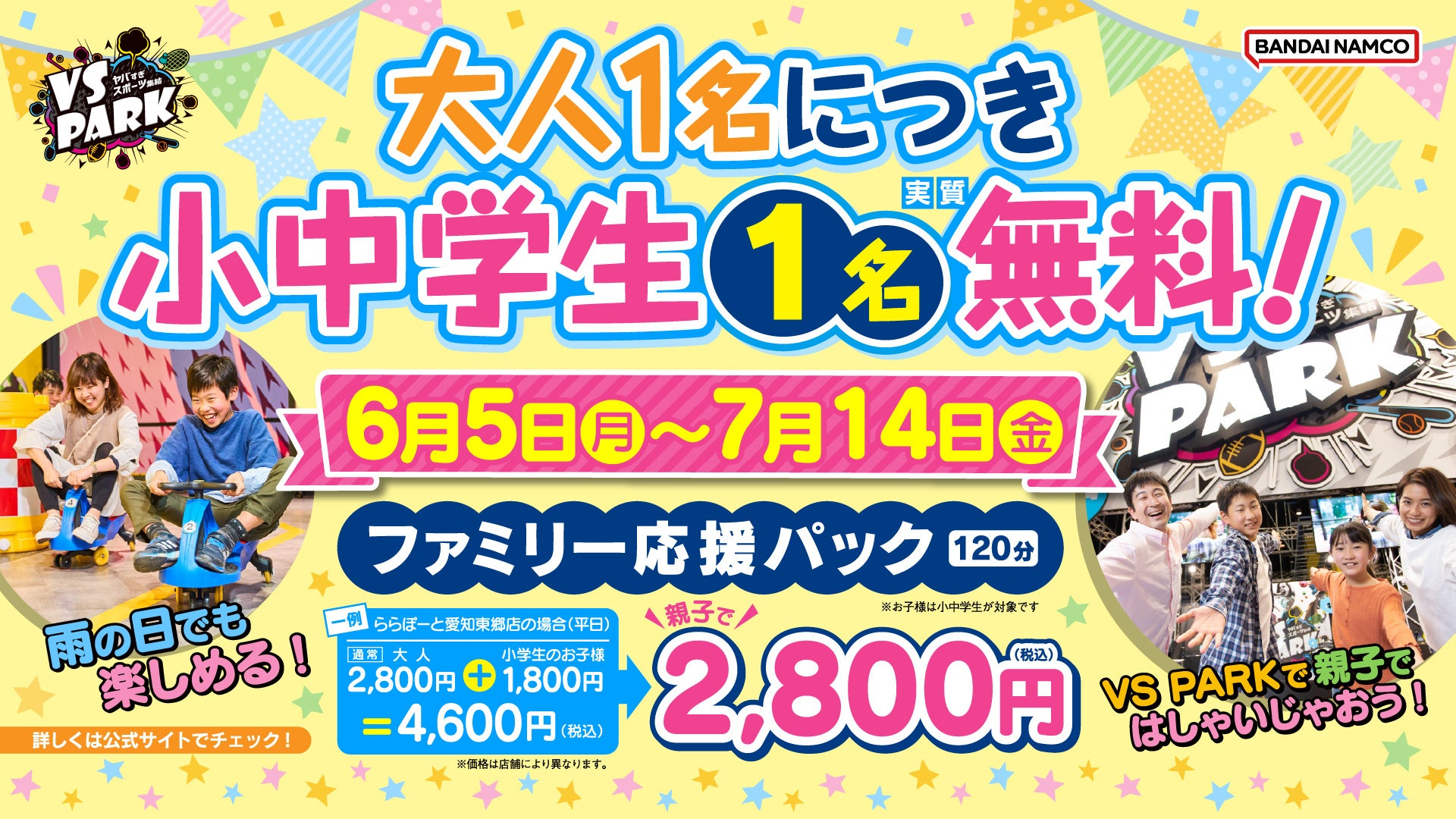 株式会社バンダイナムコアミューズメントが運営する新感覚バラエティスポーツ施設『VS PARK』では、2023年6月5日(月)から7月14日(金)までの期間限定で、指定のクーポンを提示すると、大人1人分の料金で小中学生のお子さま料金が実質無料になる「ファミリー応援パック」を全店で販売します。クーポン1枚の提示で3組まで利用できます。