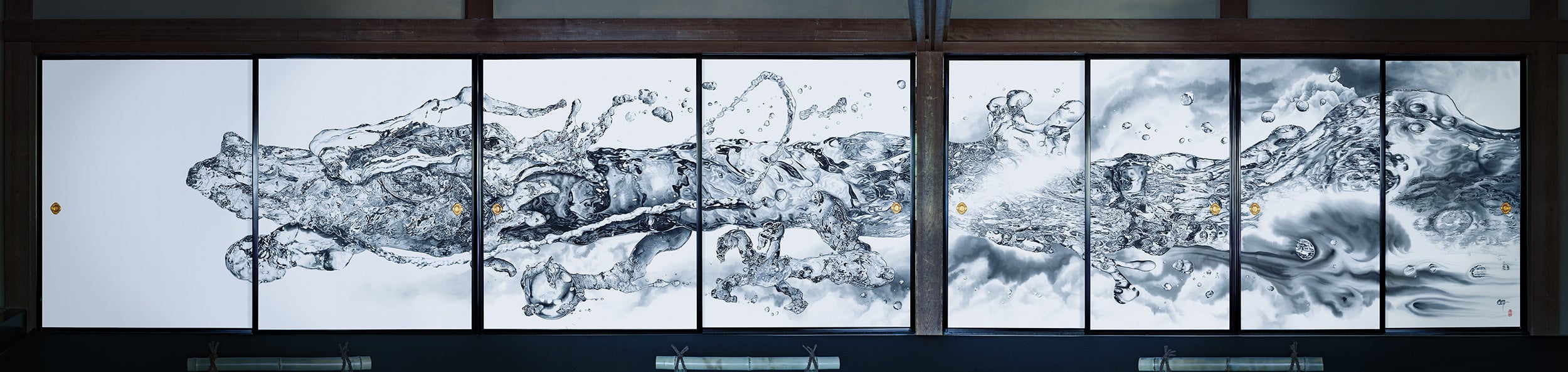 彼は水を司る神の姿を、人々に恵みを与える「清らかな水」そのもので表現したいと考え、日本の古典的な様式美を踏襲せず、類例のない、新たな様式美へと更新させました。作品右側の嵐は現在の困難な社会情勢(コロナや世界の紛争)を表現し、一方で、作品左側の空白は光を表しています。これは「全人類が明るい未来へ向かうように」という作者の願いを込めています。この襖絵は永続的に年に一期間公開される予定。100年、200年と受け継がれることでしょう。