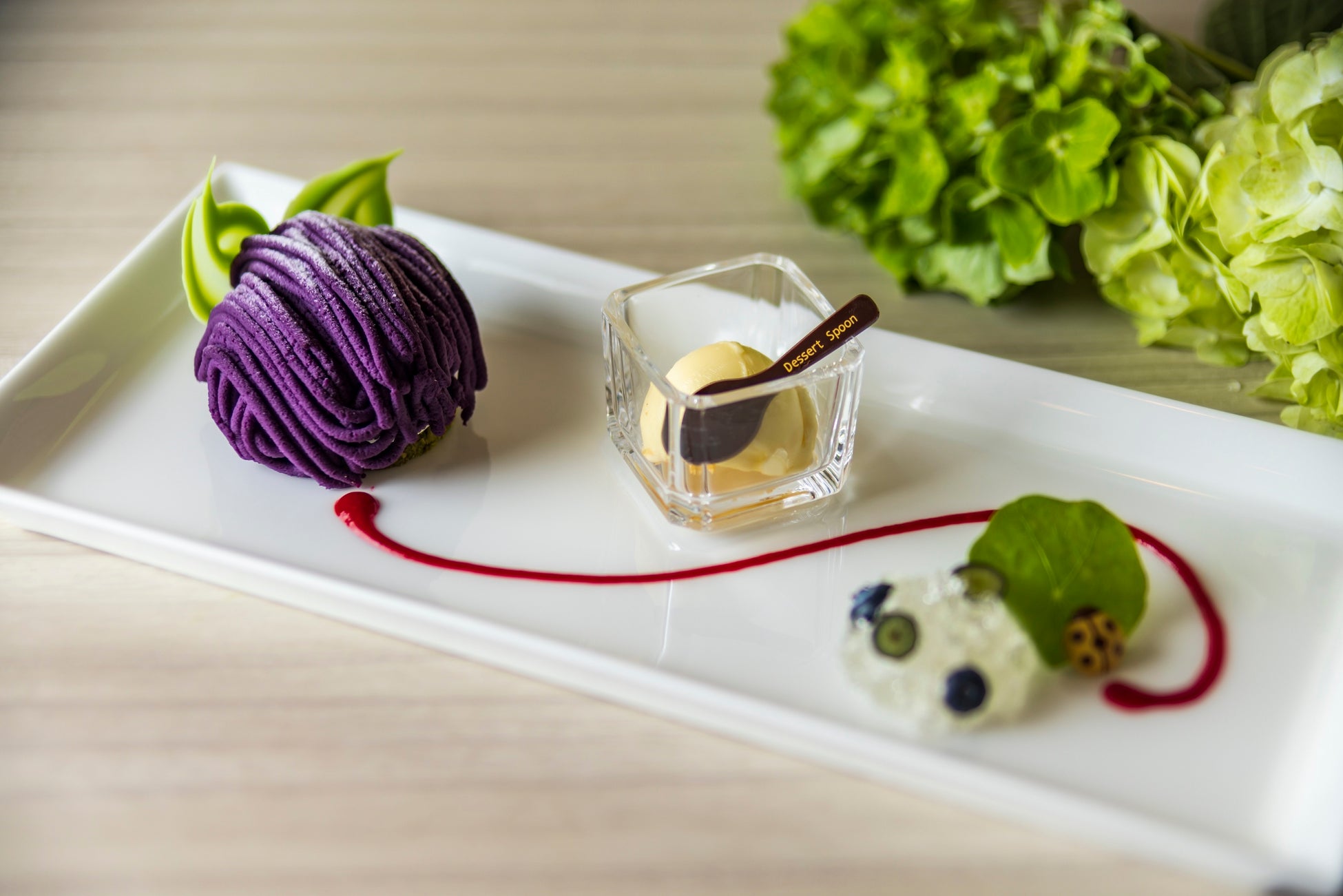 紫陽花の花に見立てたモンブランに、バニラアイスクリームを添えた「あじさいデザートプレート」です。