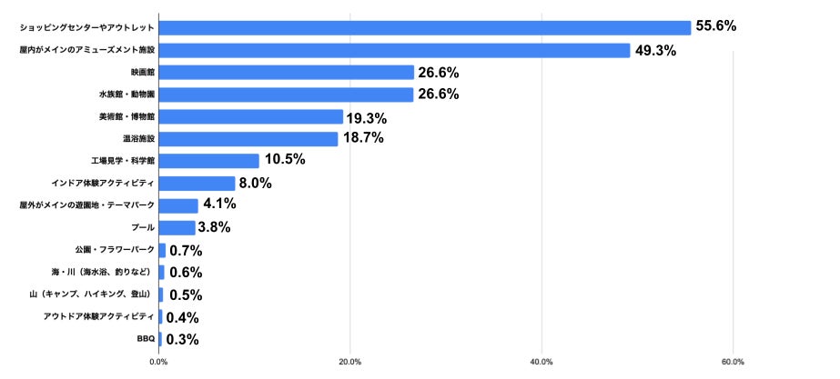 一方、行き先を変更する場合のお出かけ先としては、「ショッピングセンターやアウトレットでの買い物」が55.6%、「屋内がメインのアミューズメント施設」が49.3%となり、雨の日のお出かけ先として人気が高いことが伺えます。他にも、「水族館・動物園」「映画館」「美術館・博物館」「温浴施設」など、屋内で楽しめる施設を中心に回答を集めました。子どもがいる家庭では、「児童館」や「地域の支援センター」「図書館」なども挙げられました。