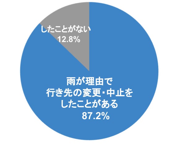 お出かけを予定している日が雨だった場合、「雨が理由で行き先の変更・または中止をしたことがある」と答えた人は87.2%に上り、約9割の人が天候を理由にお出かけ先の変更や中止を経験しています。