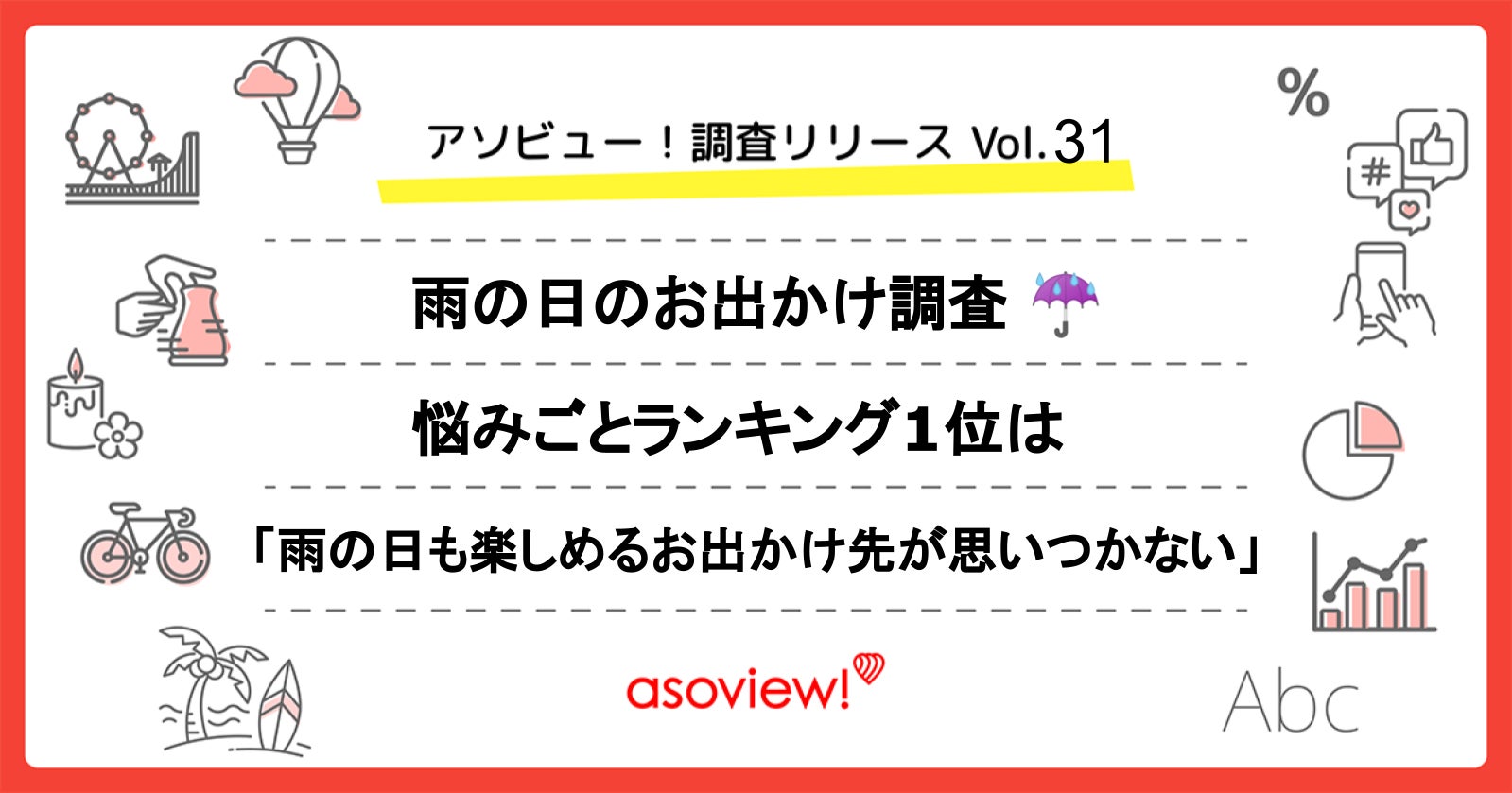 雨の日も、お出かけを中止するより「お出かけ先を変更する」人が多い中で、最も多く挙げられた雨の日のお出かけの悩みごとは「雨の日も楽しめるお出かけ先が思いつかない」というものでした。休日の便利でお得な遊び予約サイト『アソビュー!』では、雨の日のお出かけ先として人気のあった「屋内メインのアミューズメント施設」や「水族館・動物園」「温浴施設」のほか、前日や当日でも予約できるインドア体験アクティビティなど、雨の日も楽しめる様々なお出かけ先が見つけられます。