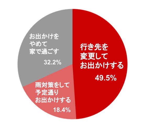 雨の日の過ごし方としては、約半数が「行き先を変更してお出かけをする」、約2割が「雨対策をして予定通りお出かけする」と回答しました。「お出かけをやめて家で過ごす」と回答した人は約3割にとどまり、お出かけ自体を中止して家で過ごすよりも、行き先を変更して新たなお出かけプランを立て直す人が多いことがわかります。