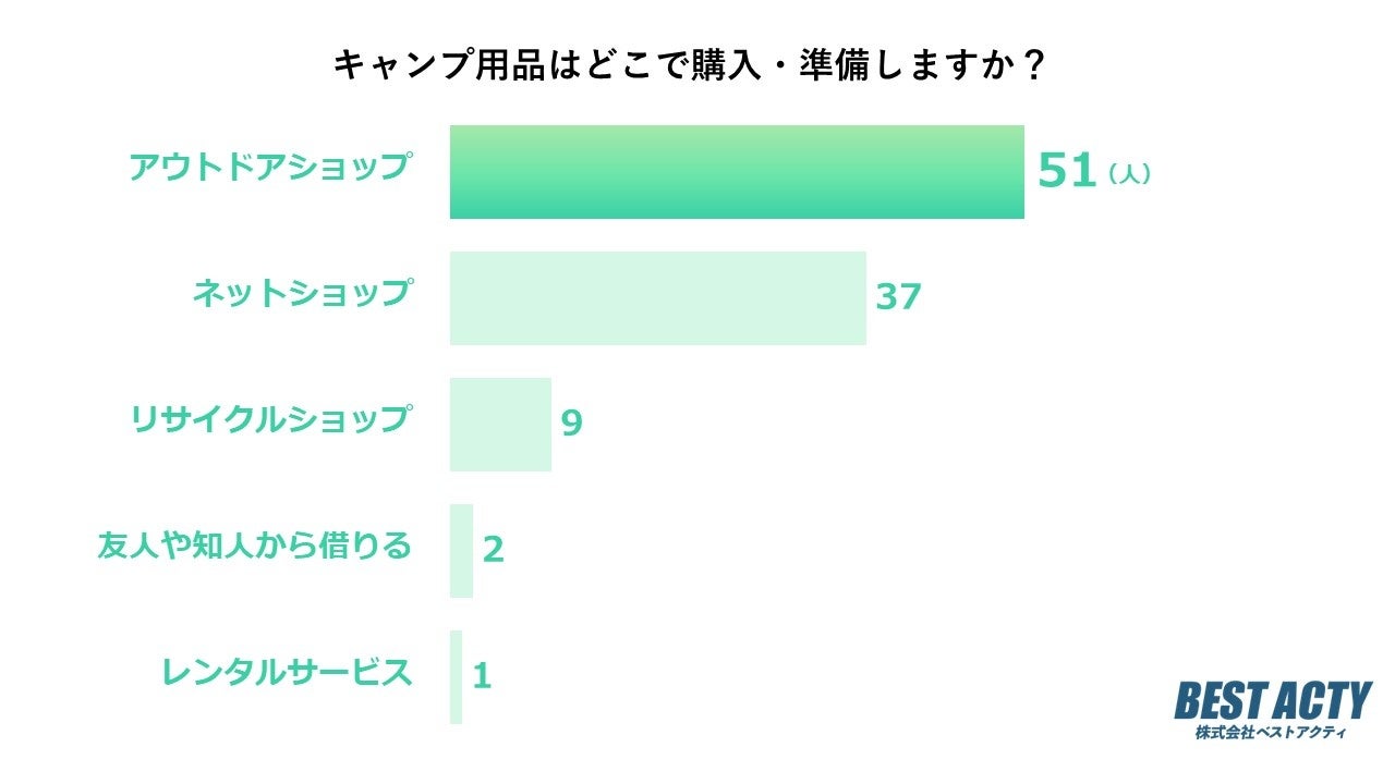 キャンプ用品をどこで購入・準備するかについて100名にアンケートを行ったところ、「アウトドアショップ」と回答する人が最も多い結果となりました。