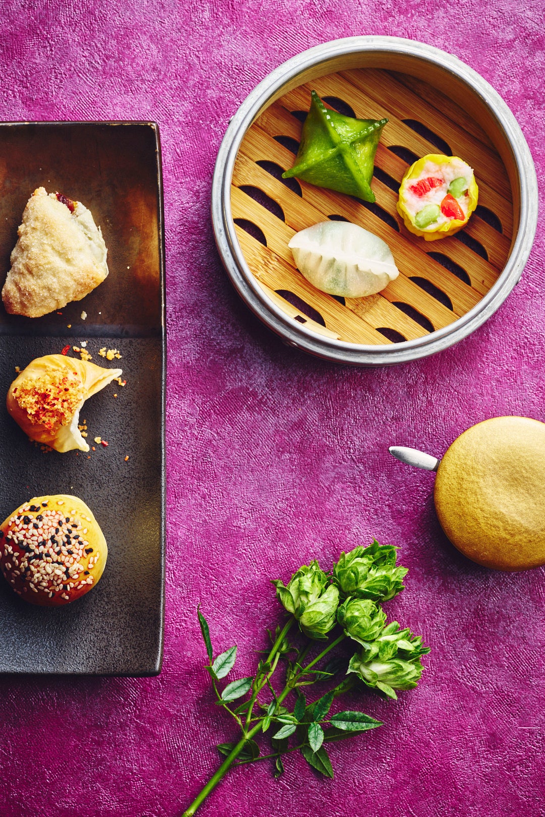 ニラの絞り汁を皮に練り込んだ鮮やかな翡翠色の生地に、エビ、豚背脂、ニラ、タケノコの餡を包みました。食材の旨味を凝縮した食べ応えのある蒸し餃子。