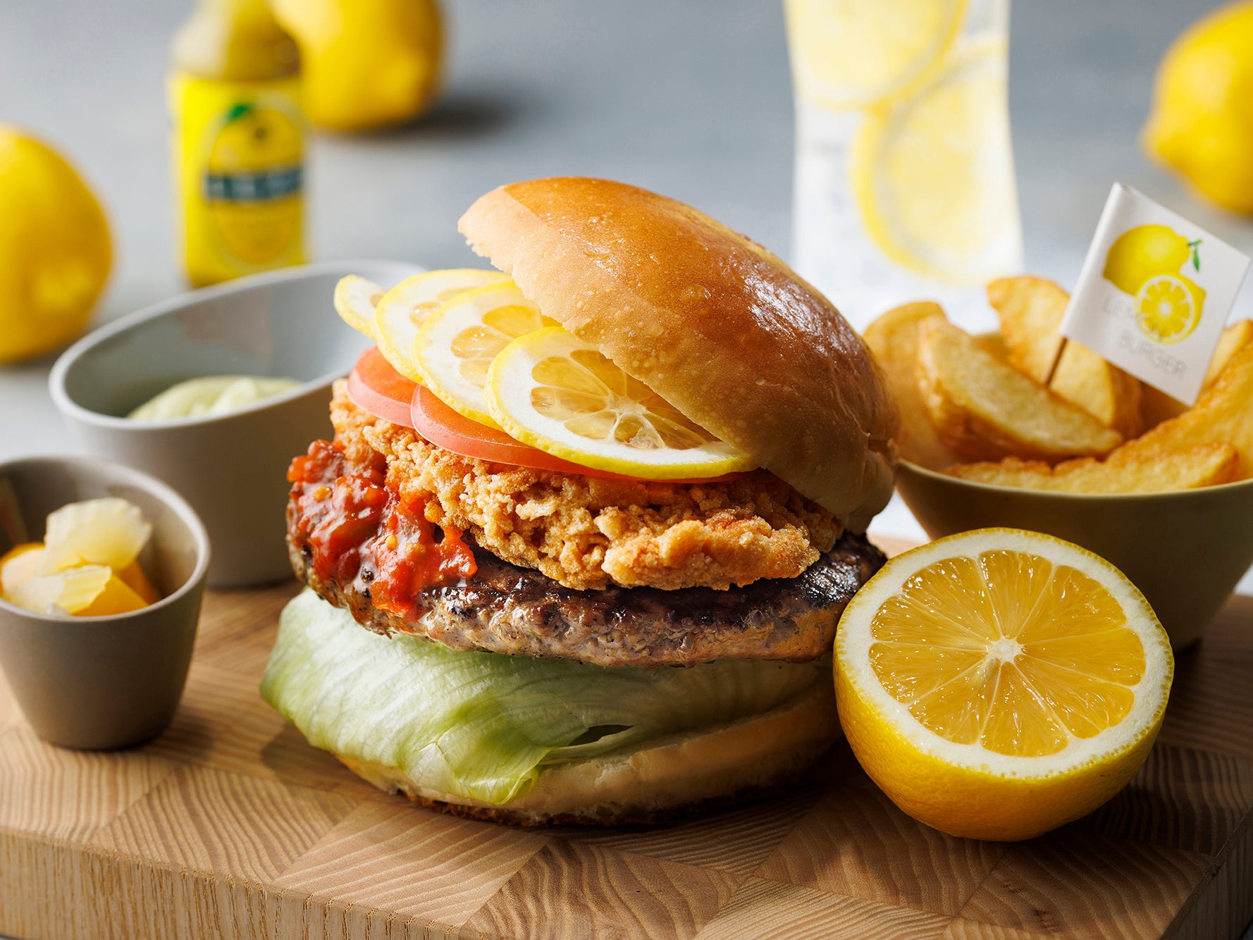 当レストランの今夏のテーマである「Summer Yellow(サマーイエロー)」に合わせ、見た目からも“黄色”を感じていただけるように、ハンバーガーにレモンを組み合わせました。レモンピールを練り込んだシェフこだわりのバンズに、国産牛100%のビーフパテ、夏が旬の青パパイヤと青唐辛子のピクルス、東南アジアのスパイス・サンバルチリを入れたタルタルソースを重ね、さらにレモングラスでマリネした鶏肉に柿の種を纏わせて揚げたクリスピーチキン、自家製塩レモンの輪切りなどを挟み込みました。ビーフのパテとカリカリのチキンを引き立てるレモンの数々やサンバルチリ、ピクルスが織りなす味の共演は、暑い夏にぴったりな食欲をそそるハンバーガーです。横に添えられたフレッシュレモンを絞れば爽やかさもアップし味の変化もお楽しみいただけます。またハンバーガーに合わせて、フレッシュレモンを入れた「スパークリングレモネード」も同時に発売いたします。