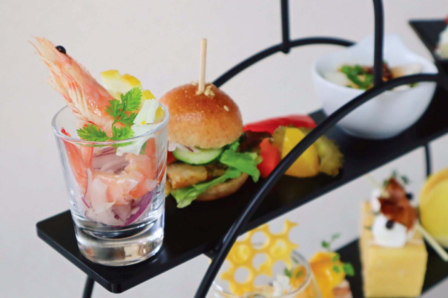 【セイボリー】シュリンプカクテル/よだれ鶏/桃のカプレーゼ/ミニバーガー/ホテルメイドピクル