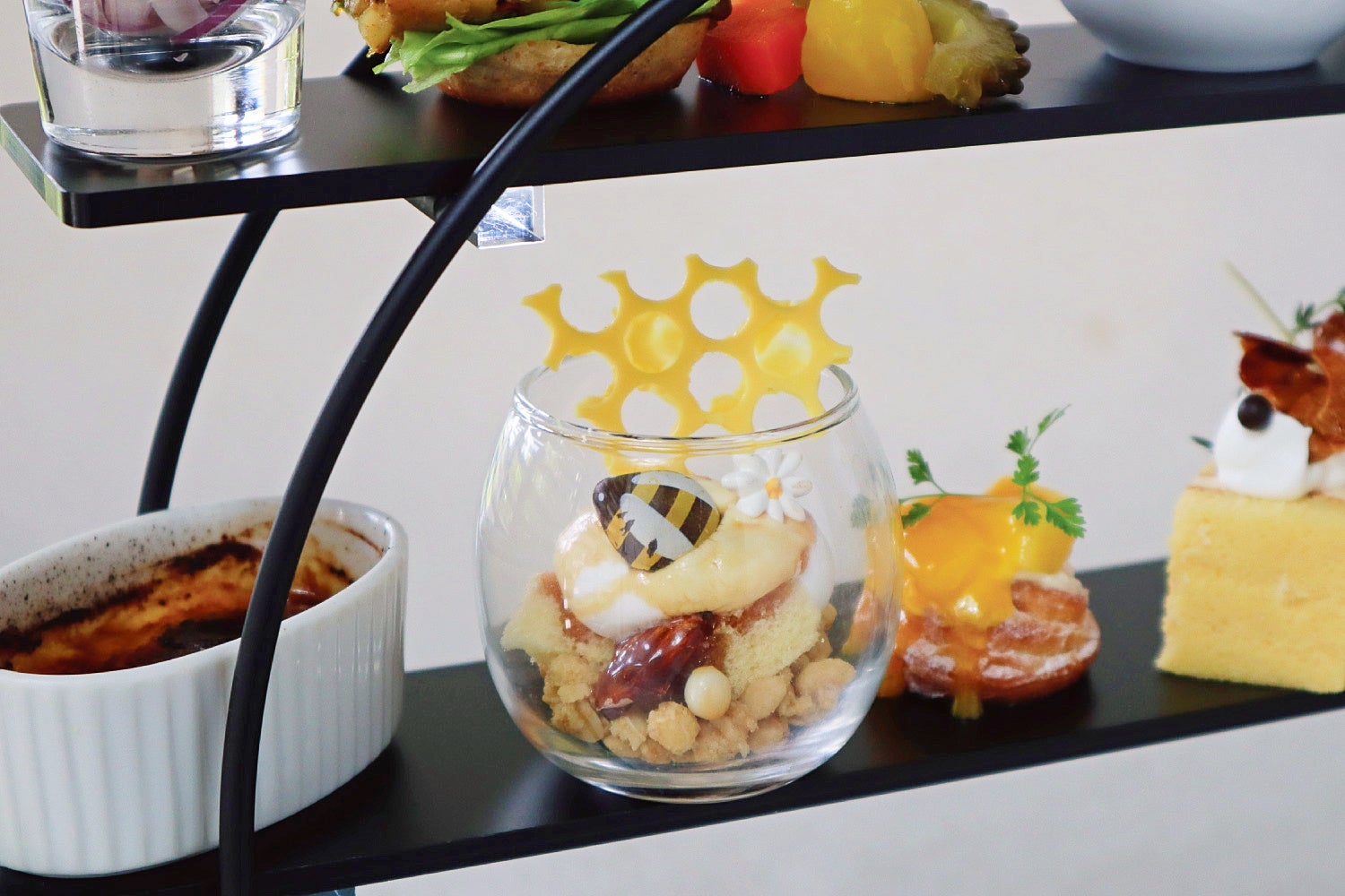 ノボテル沖縄那覇(那覇市:坂本公敏 総支配人)では、「首里王朝蜂蜜」を使ったグルメバースタイル アフタヌーンティーを販売しています。ホテルが建つ那覇市首里エリアは「首里城(しゅりじょう)」や「玉陵(たまうどぅん)」など世界遺産があり、琉球王国時代は王都として繁栄を極めた地。その首里に咲くの花の蜜で作られる「首里王朝蜂蜜」をふんだんに使ったアフタヌーンティー”はちみつとメープル”をご用意。蜂蜜と洋酒の香りを楽しめる「はちみつカヌレ」や蜜蜂が花の蜜を集めに来る様子をイメージした「みつばちが乗ったミニパフェ」、その他、マンゴーのプチデニッシュなど多数揃います。