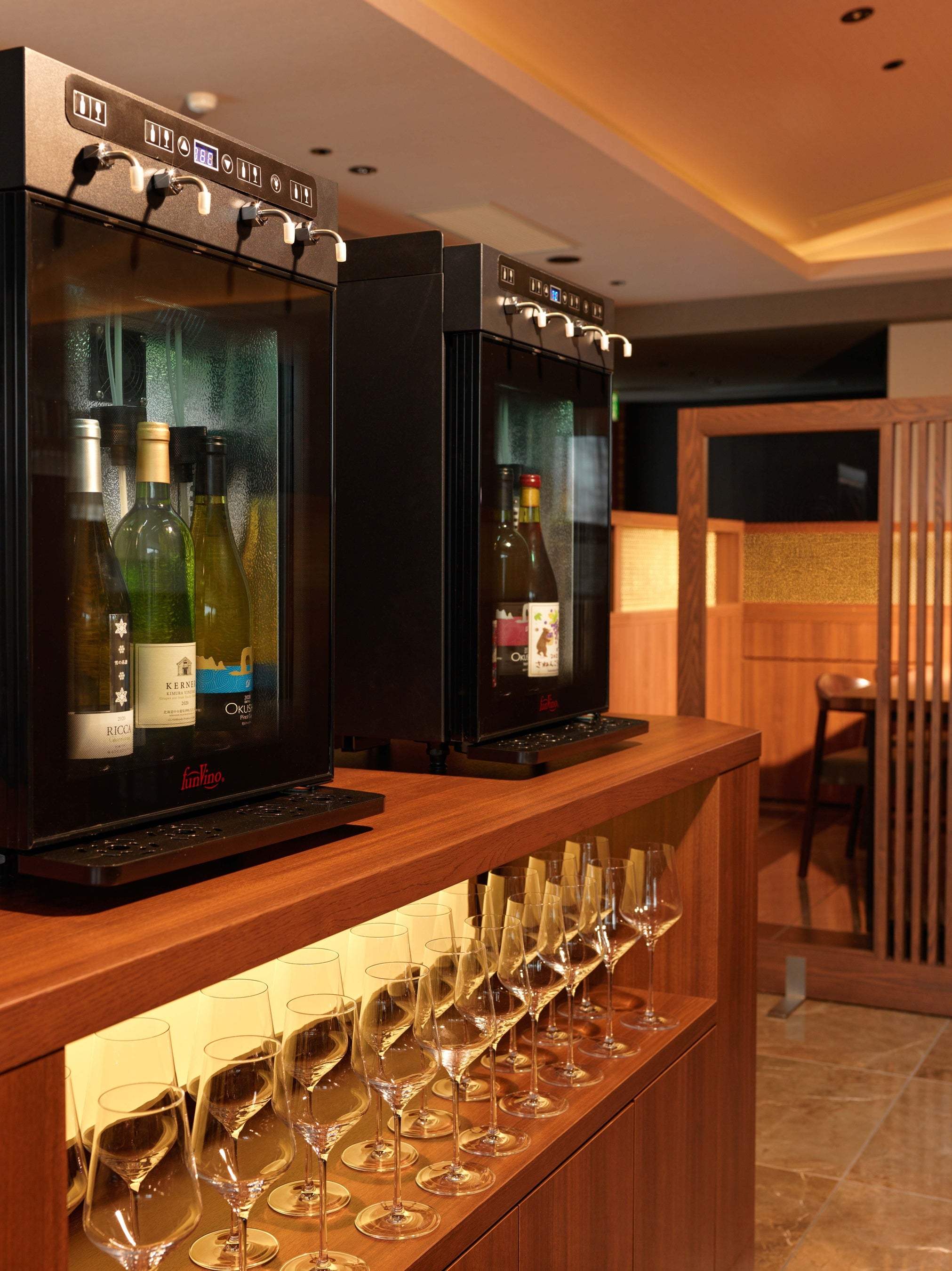 レストラン会場「千歳千年」の中央にはワインサーバーが設置されており、16種類(北海道産12種・外国産4種)のワインをオプション(有料)ご用意しております。