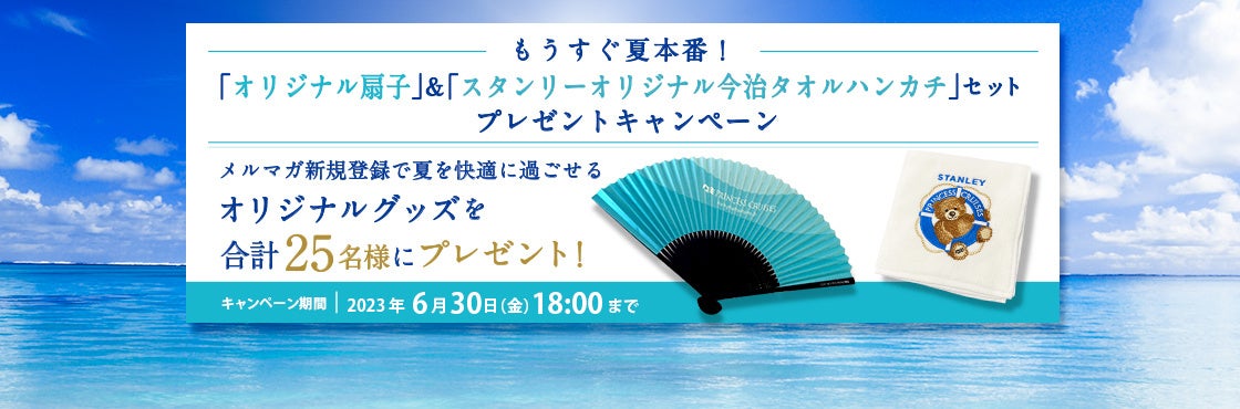 プリンセス・クルーズ(https://www.princesscruises.jp/)は、日頃の多大なるご支援とご愛顧に感謝を込め、キャンペーン期間中にメールマガジン「プリンセス・メール」(https://www.princesscruises.jp/mail-member/)に新規ご登録いただいた方の中から抽選で25名様にオリジナル扇子&スタンリー今治タオルハンカチセットが当たるプレゼントキャンペーンを実施します。キャンペーンの詳細は、「オリジナル扇子&タオルセット プレゼントキャンペーン」ページよりご確認ください。
