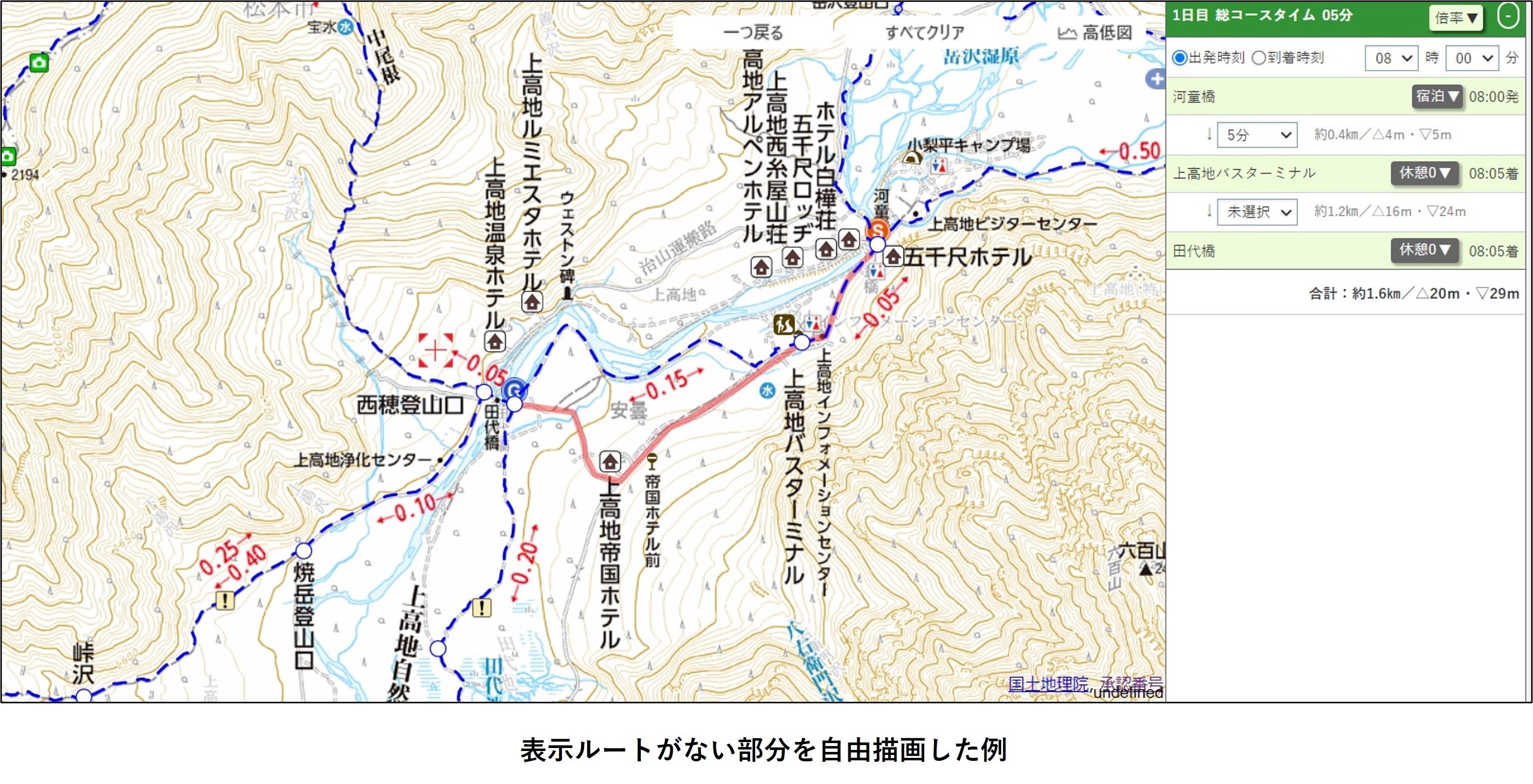 これまでは、ヤマタイム地図上のルート表示をたどって登山計画を立てる形式でしたが、ルート表示がない場所でも計画ルートを自由に描画できるようになりました。これにより、表示ルートの途中から一度離れ、ルート表示がない場所を経由して再び表示ルートに合流する、といった計画も立てることができます。