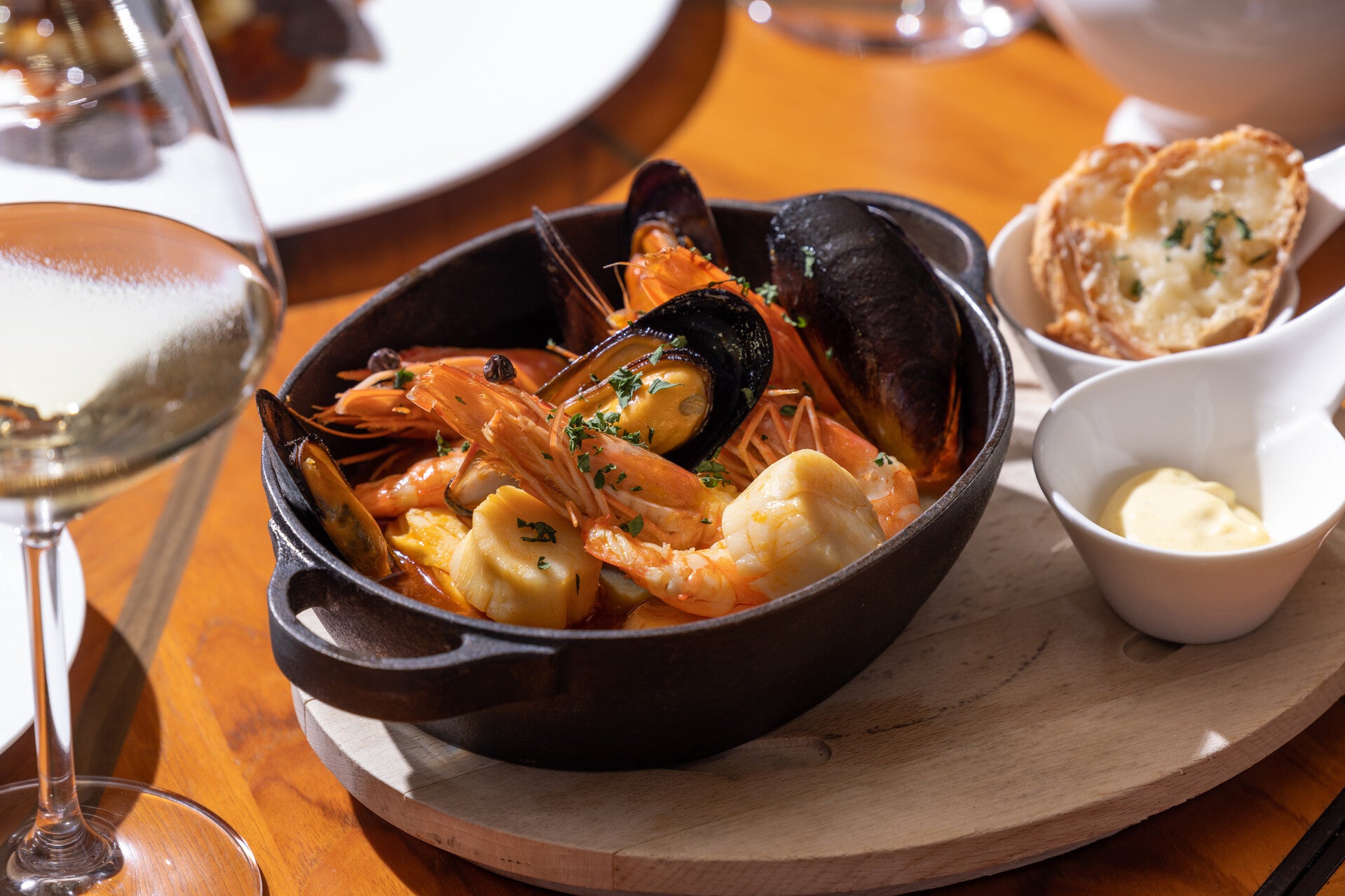 南仏の郷土料理・ブイヤベースを、本場の味に忠実に再現。本来のブイヤベースのレシピが必要とする「魚4種」という条件を満たしながら、そこに旬の魚に貝やエビなども加え、具沢山に煮込みあげました。海の旨味が凝縮し、香り立つ本格的な味わいです。