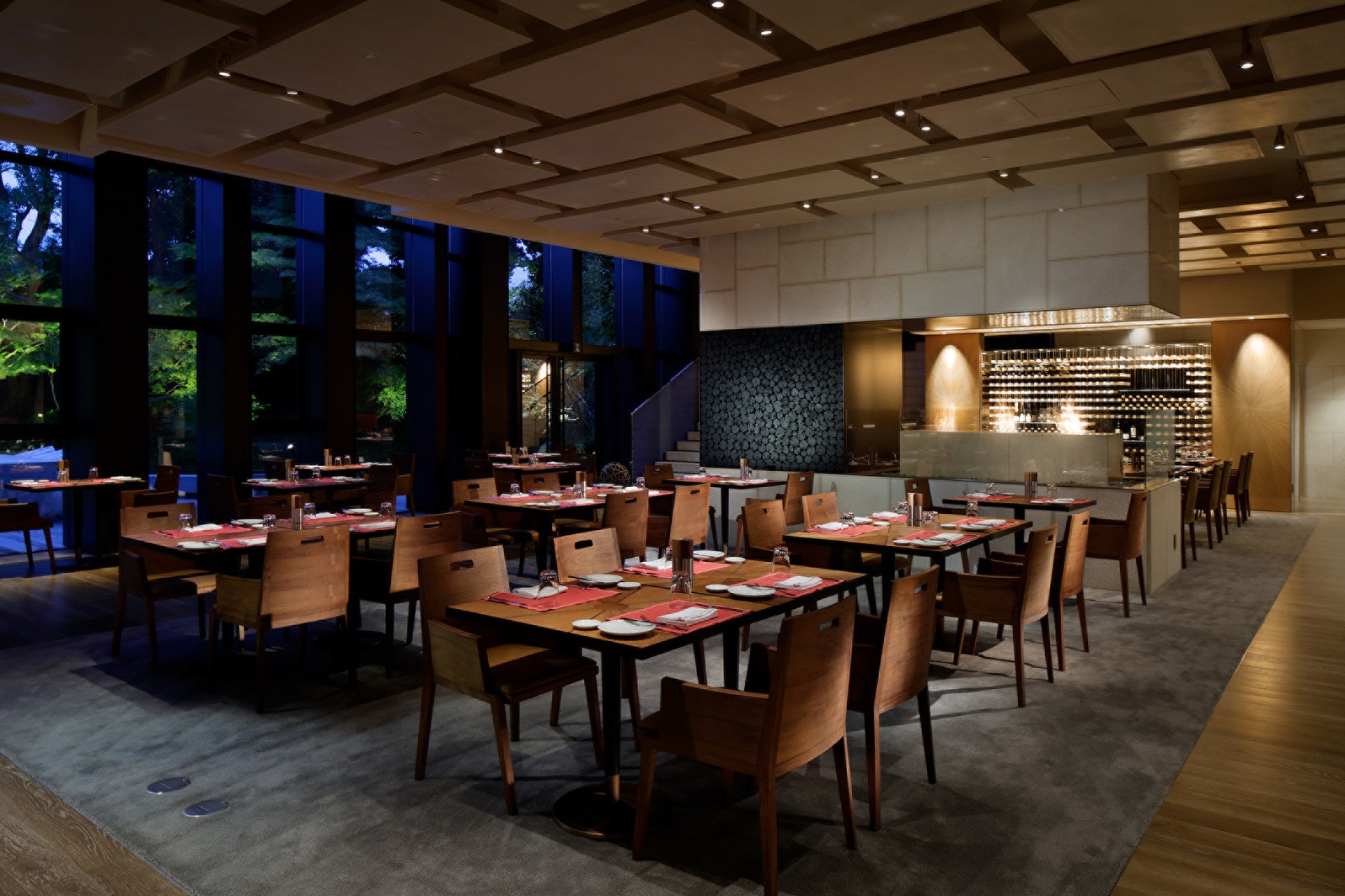 ホテル1階に位置する「ブラッスリー」は、高さ9メートルの大きな窓からその名庭を見渡し、店内にはスタイリッシュな空間が広がります。庭園を見渡すテラスを備えたその開放的なインテリアデザインは、「Kokai Studios(コカイ・スタジオ)」によって手がけられ、国際的なインテリア専門誌「INTERIOR DESIGN(インテリアデザイン)」におけるベスト・オブ・イヤーアワード、ホテルダイニング部門において2017年のショートリストに選ばれています。