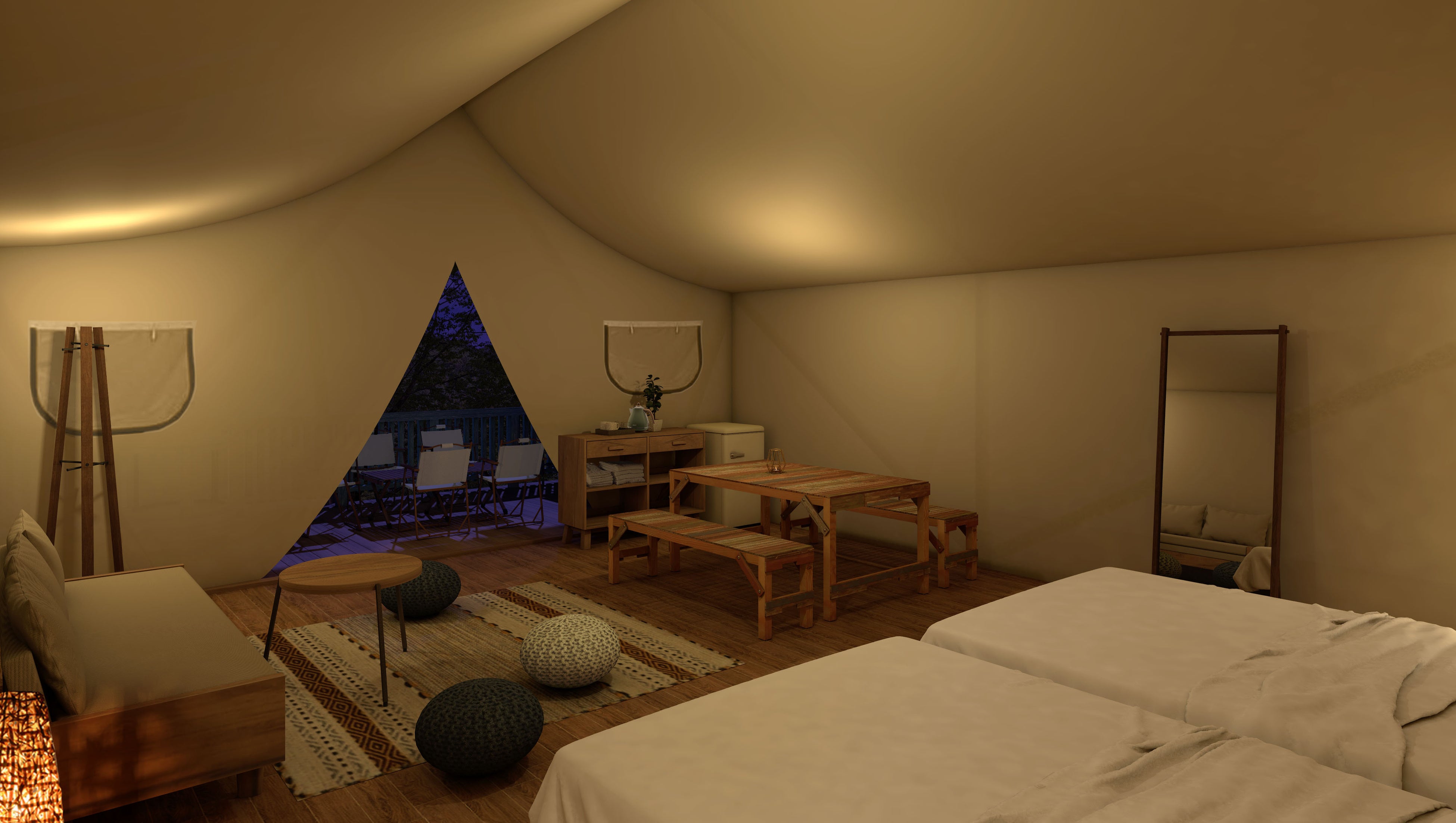 森に囲まれたグランピングエリアにあるテントキャビン。