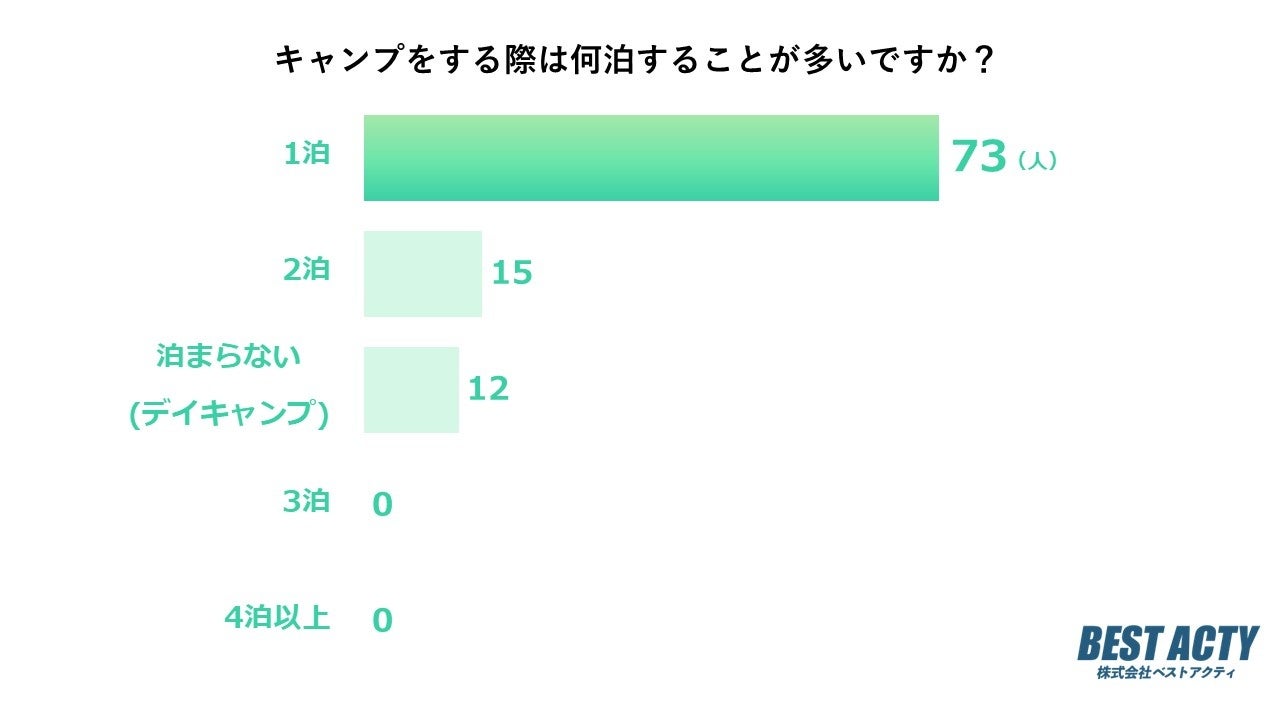 キャンプをする際に何泊することが多いかについて100名にアンケートを行ったところ、「1泊」と回答する人が最も多い結果となりました。
