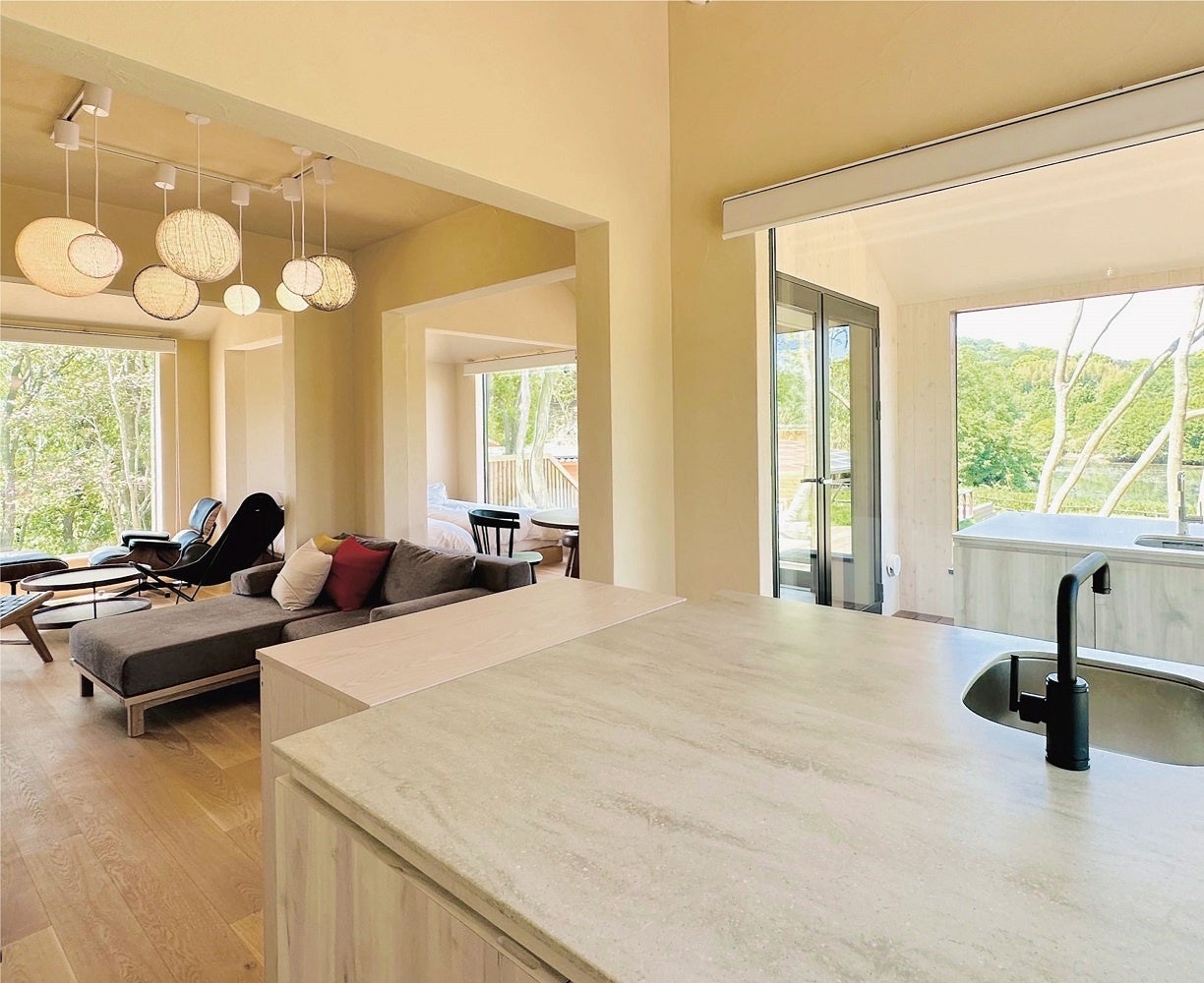 MOUNT LAKE re:sort kiki(マウントレイク リ・ソート キキ)木々に囲まれた場所、木々、きき、kikiと名付けました。穏やかに流れる湖の音や爽やかな樹木に包まれながらゆっくりと心と体を委ねる時間をお楽しみいただけます。