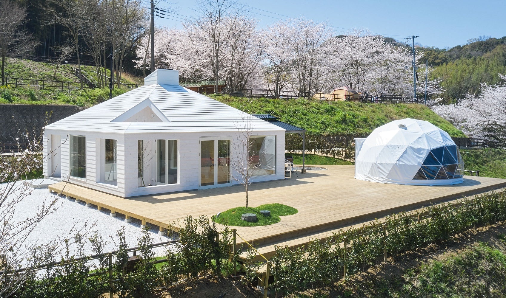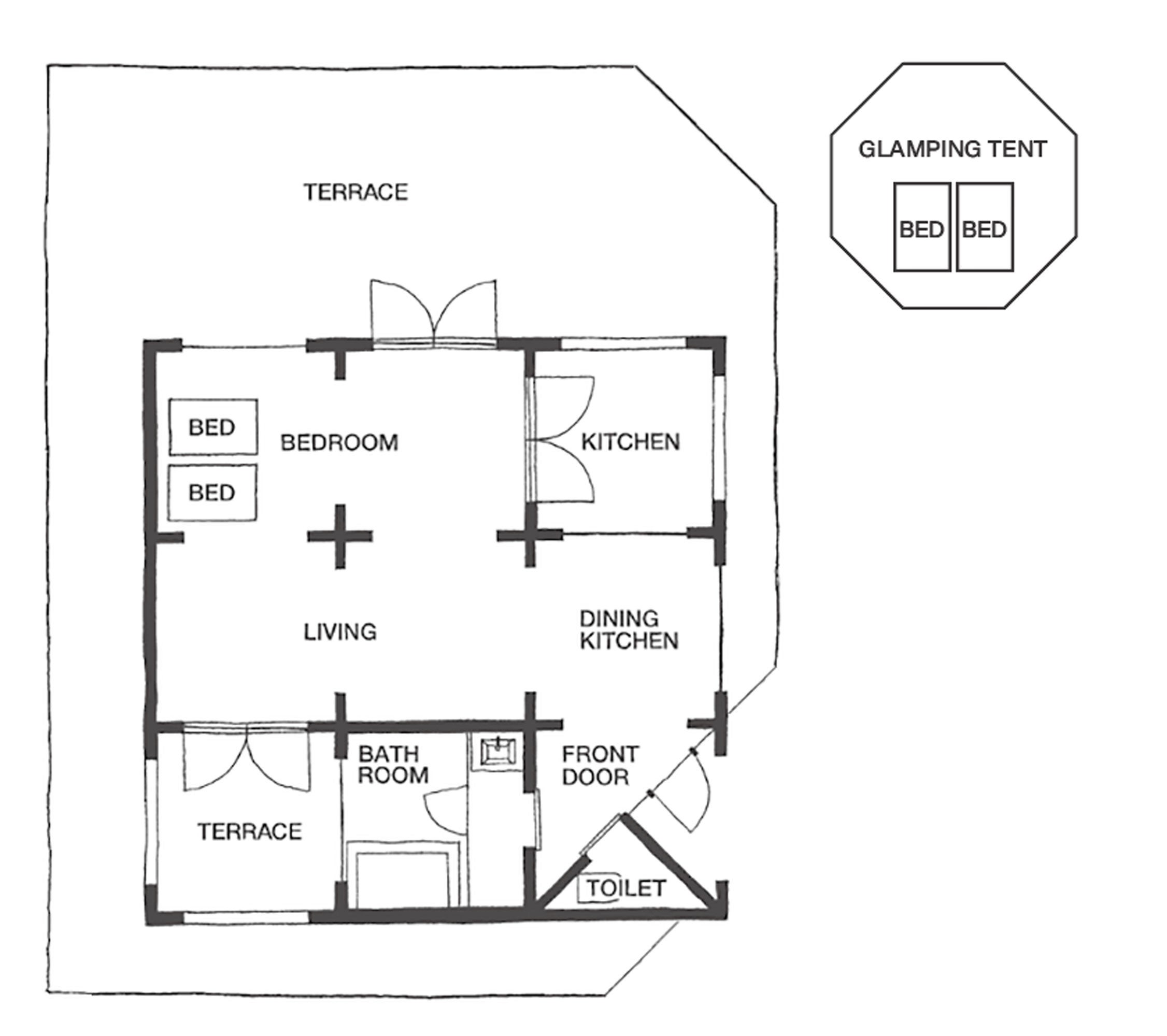 ●ダイニング(キッチン付き)1部屋 [広さ]8㎡ ●リビングルーム 2部屋 [広さ]15㎡ ●ベッドルーム 2部屋 [広さ]15㎡ ●浴室・洗面 [広さ]8㎡ ●テラス [広さ]50 ㎡ ●テント [広さ]20 ㎡ ●ガゼボ(雨よけ) [広さ]9㎡ ●共有サウナ [広さ]8㎡