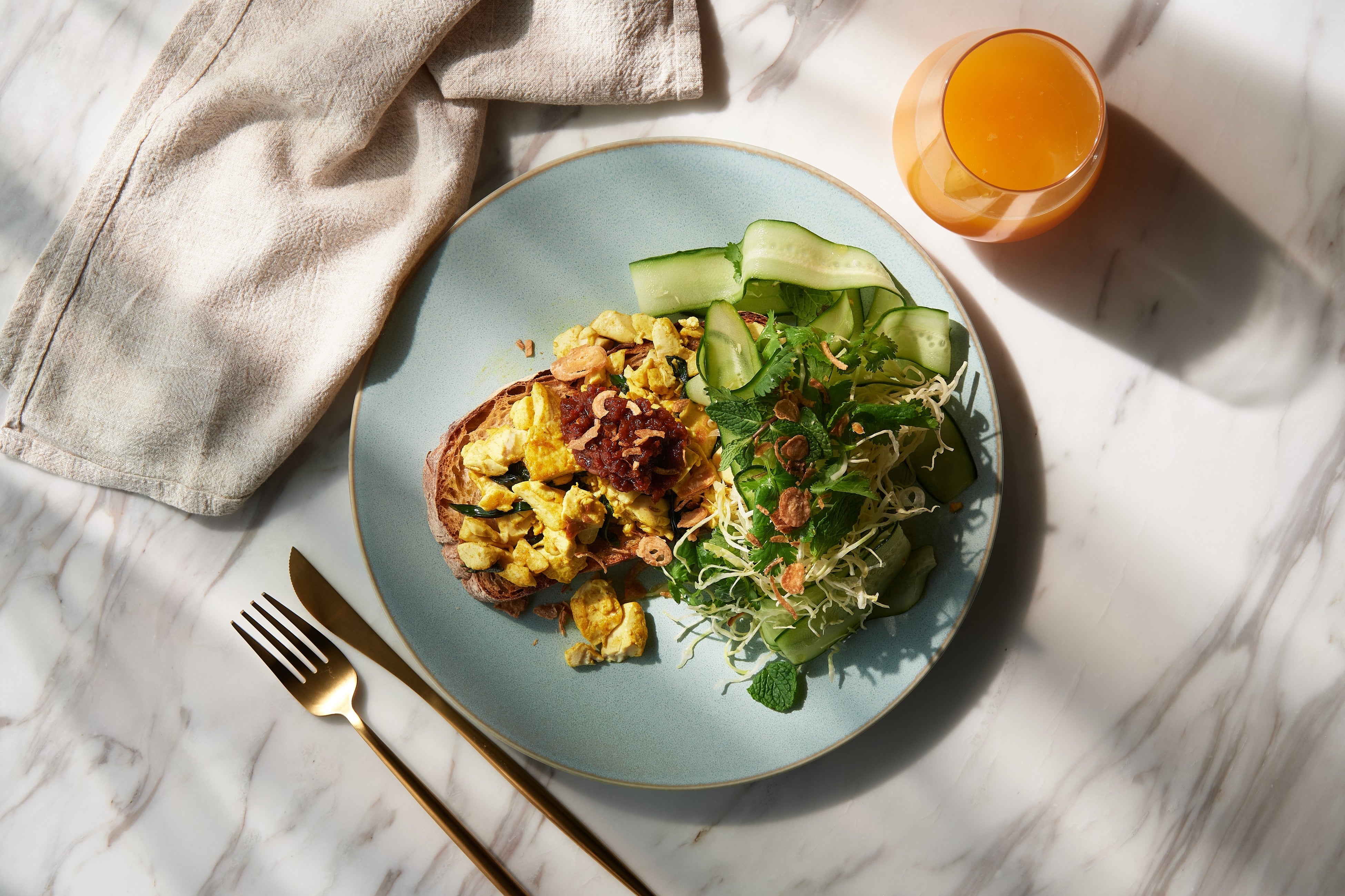卵の代わりに豆腐をつかったヴィーガンオープンサンド。マレーシアやシンガポールで定番のチリソース「サンバル」の辛さがよく合います。