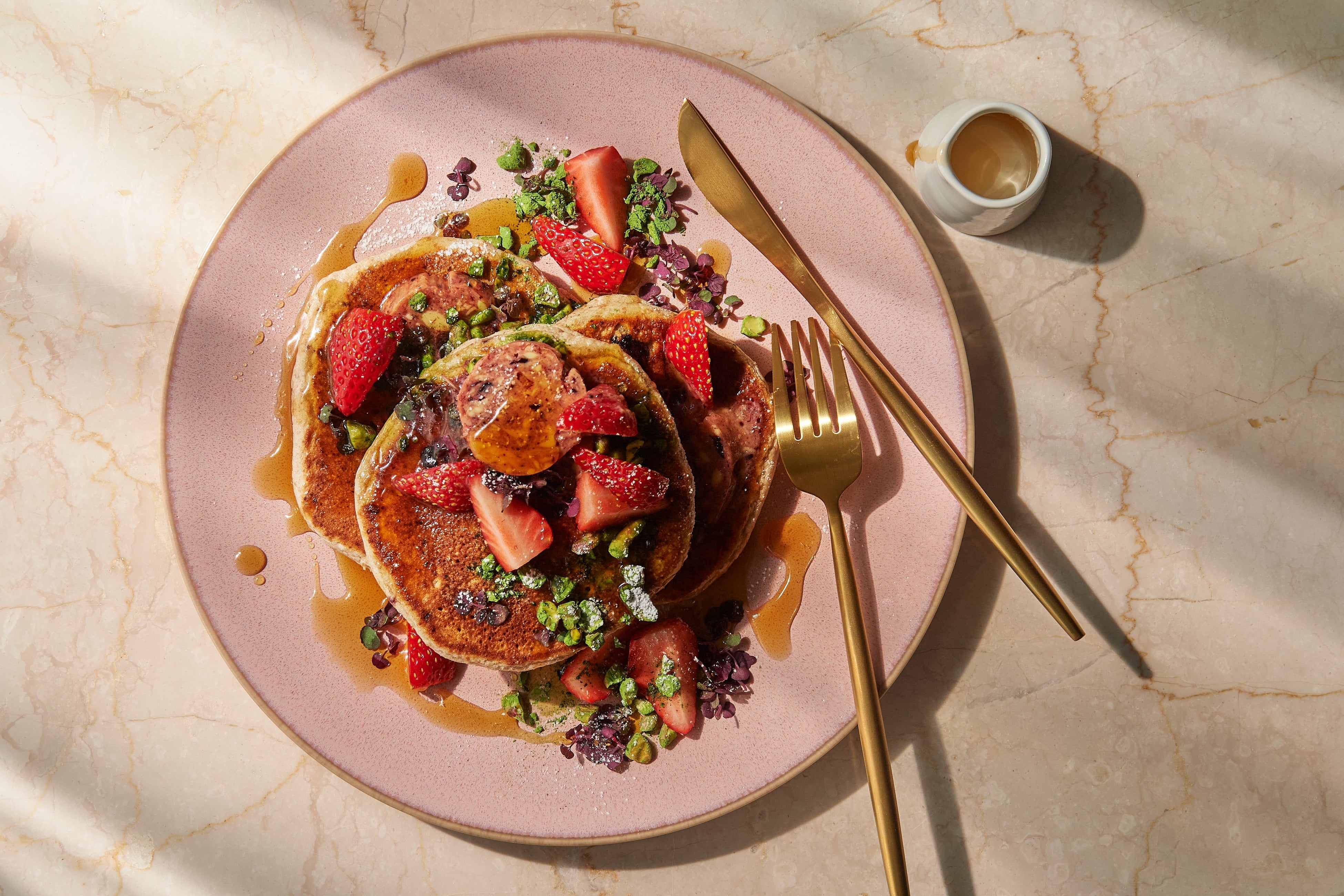 ベリーベリーパンケーキ – 苺、八女抹茶、ベリーバター、ピスタチオ、ムラメ