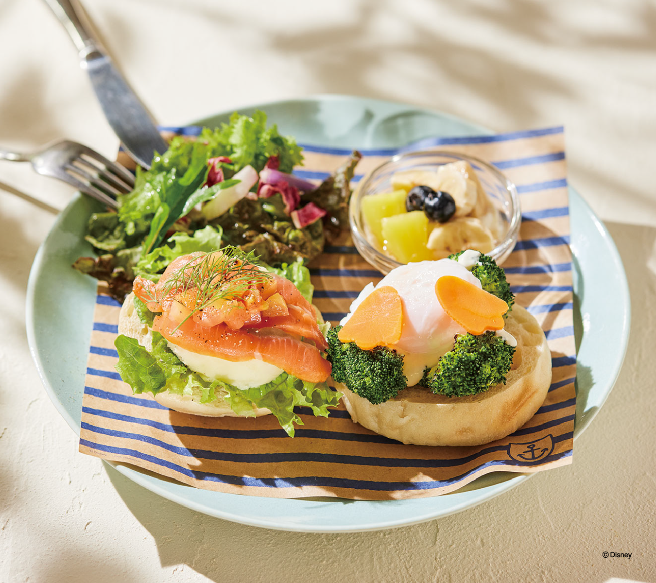 ドナルドダックが海にダイブしたイメージのポーチドエッグと、スモークサーモンやたっぷりの野菜に爽やかなヨーグルトソースを合わせたオリジナルエッグベネディクトです。※横浜赤レンガ倉庫限定