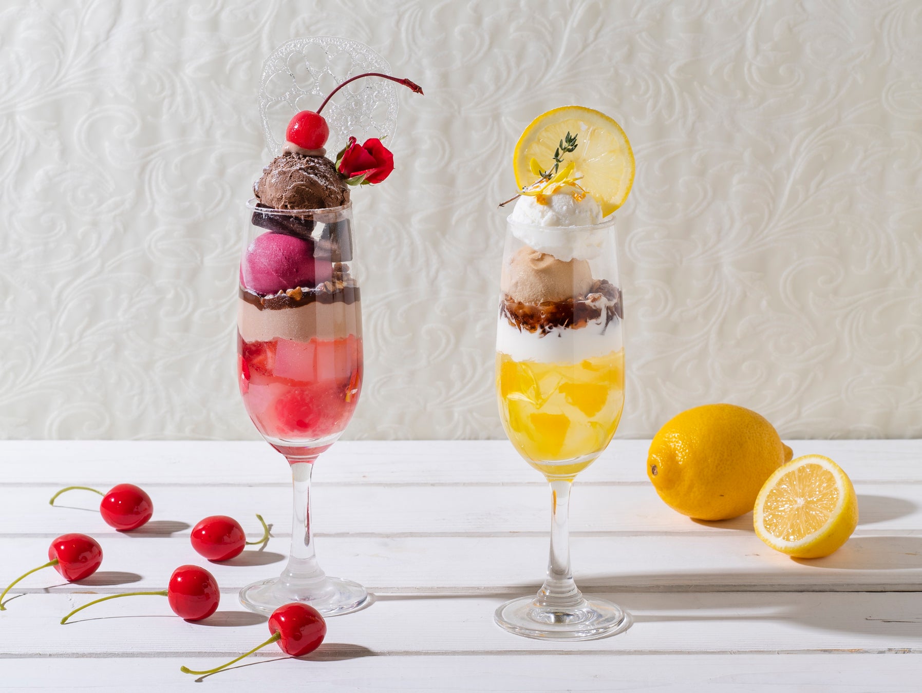 さくらんぼとチョコレートのフラワーパフェ・紅茶とクリームチーズのフラワーパフェ