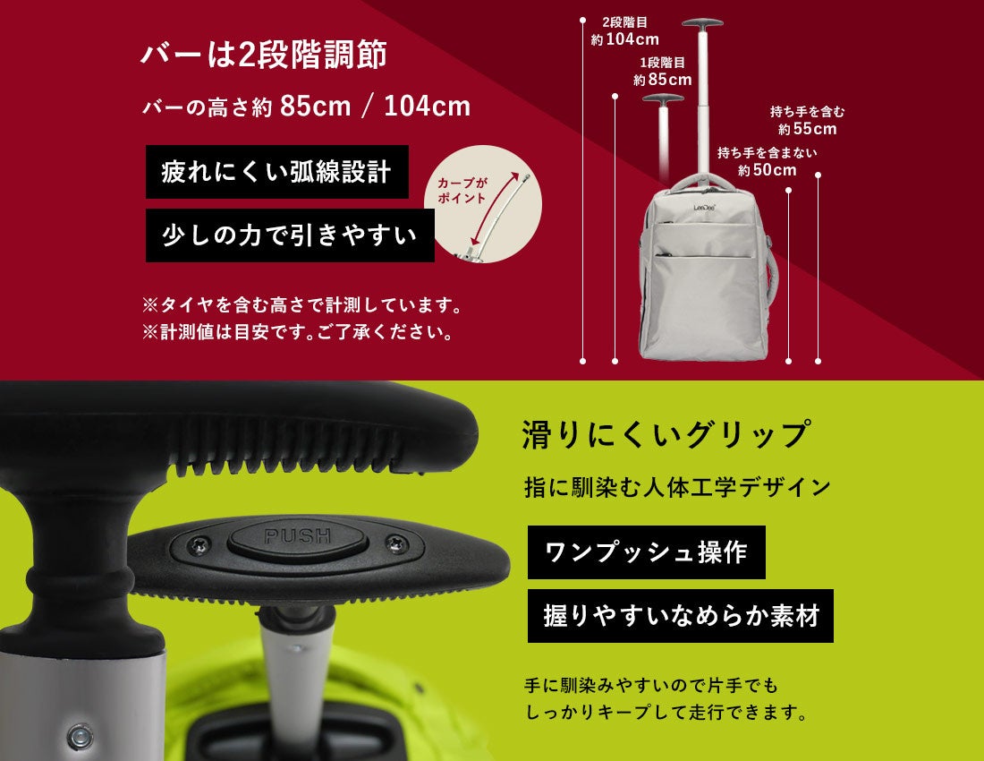 キャリーバーは少しの力で引きやすく、疲れにくい弧線設計。また、手に馴染んで滑りにくいグリップなど、人体工学に基づいたデザインで体の負担を軽減します。