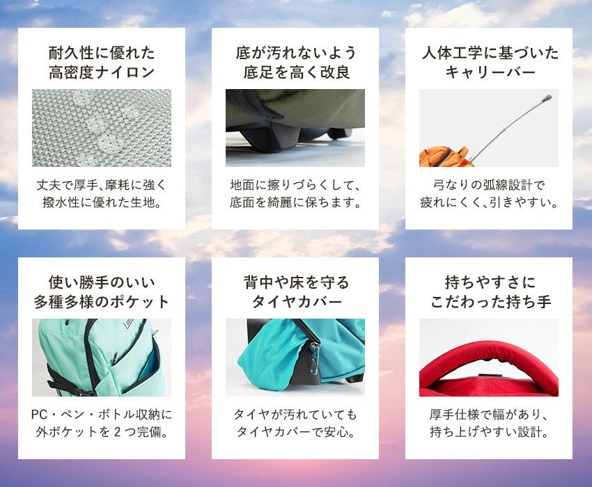撥水性・耐久性に優れた高密度のナイロン生地、振動を吸収する静音タイヤなど、使用パーツから細部の設計にいたるまで使いやすさにこだわってデザイン。リュックとして使用する際は、収納ポケットからリュックベルトを取り出して留め具を装着、お好みでタイヤカバーをつけるだけ。スムーズな操作性も魅力のひとつです。