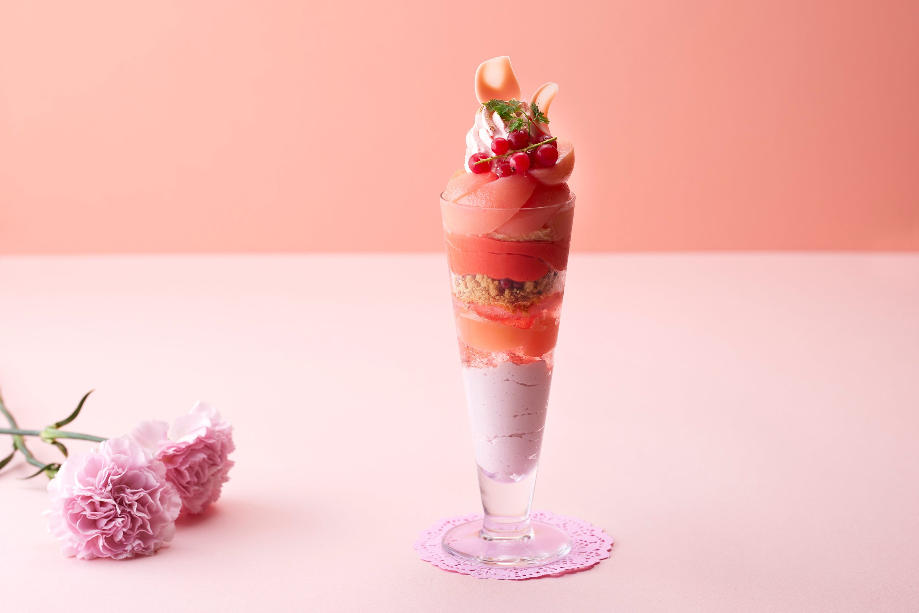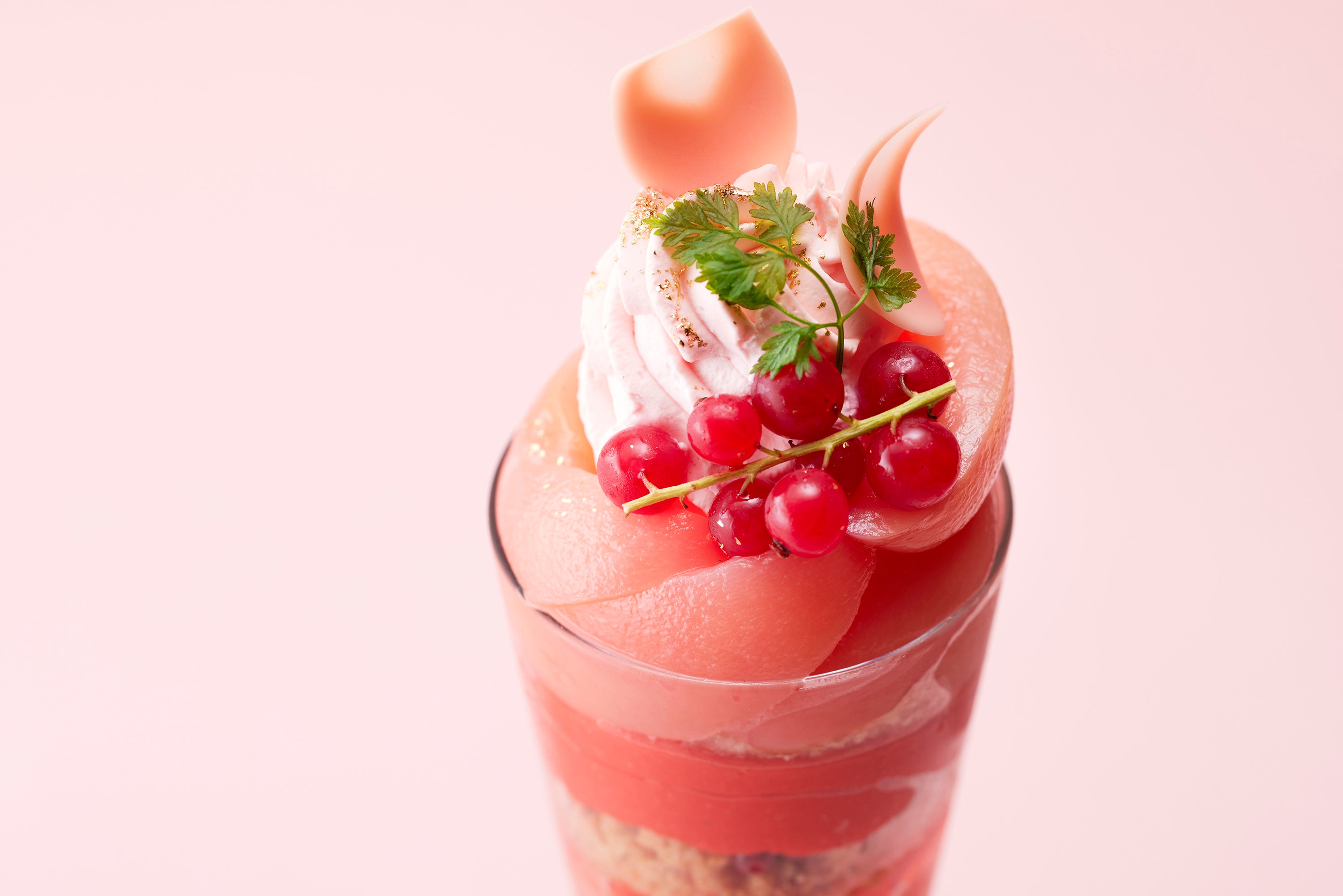 最下部には口どけのよい「赤桃のパンナコッタ」を敷き詰め、その上にさっぱりとした「ジュレペーシュ」と、ほど良い酸味と果肉感がたまらない「コンポートペーシュ」を重ねました。甘酸っぱくて爽やかな「サクランボジェラート」、見た目にも可愛い「ピンクのカスタードクリーム」、しっとりとした食感の「ジェノワーズ」を使用し、ピンクの世界の中で様々な味わいをお楽しみいただけます。トップには桃をまるごと1個使用したジューシーな「コンポートペーシュ」を贅沢に並べ、「ピンクシャンティー」「ピンクチョコレート」「赤スグリ」「セルフィーユ」を乗せ、華やかに仕上げました。