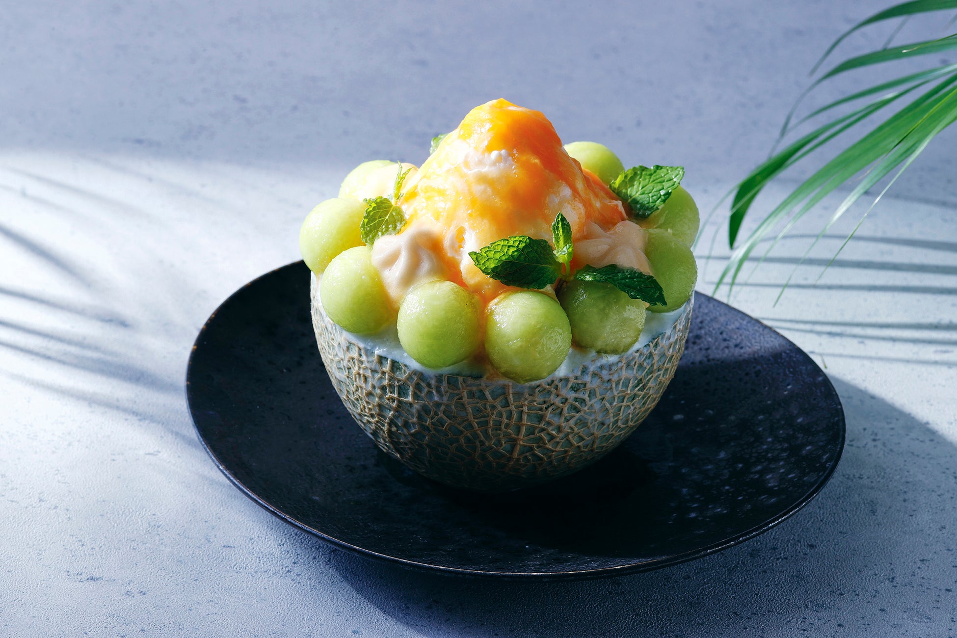 青肉の器にミルクテイストのシェイブアイスをふんわりと盛り付け、赤肉メロンのピューレとエスプーマで仕上げました。