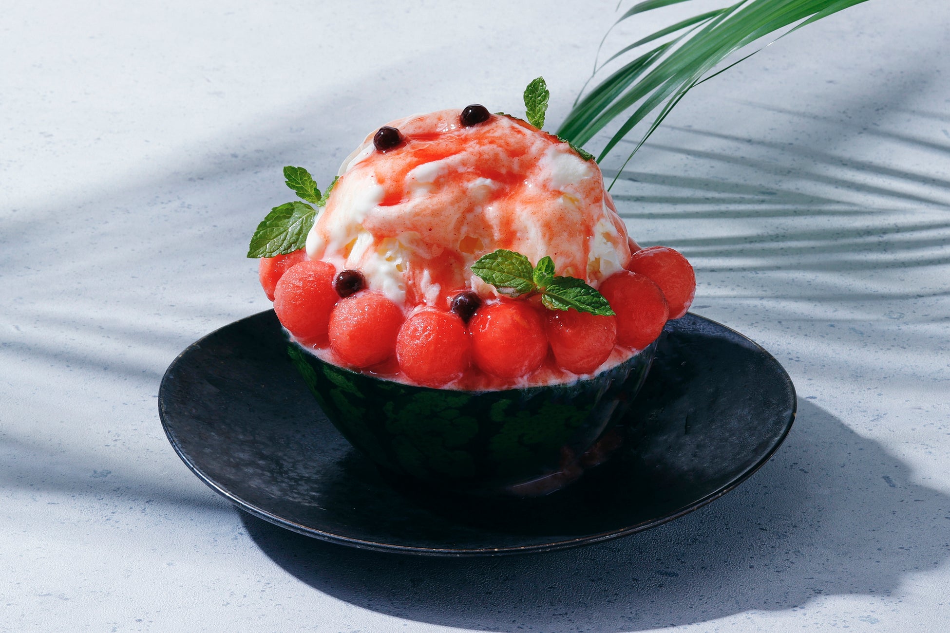すいかのみずみずしい果汁がシェイブアイスのミルクと調和します。種に見立てたタピオカの食感もお愉しみください。