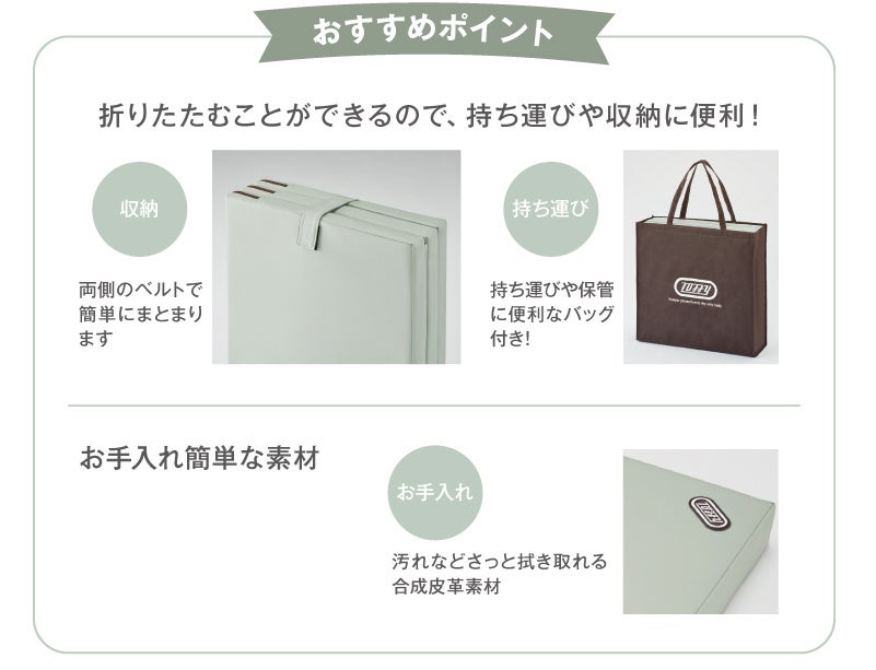 アウトドアや災害時などエクササイズ以外にもいろいろな場所でお使いいただけます。折りたたむことができ、収納や持ち運びにも便利。汚れを拭き取りやすい合成皮革素材でお手入れも簡単!1つ持っておくと安心な、マルチに使えるマットです。