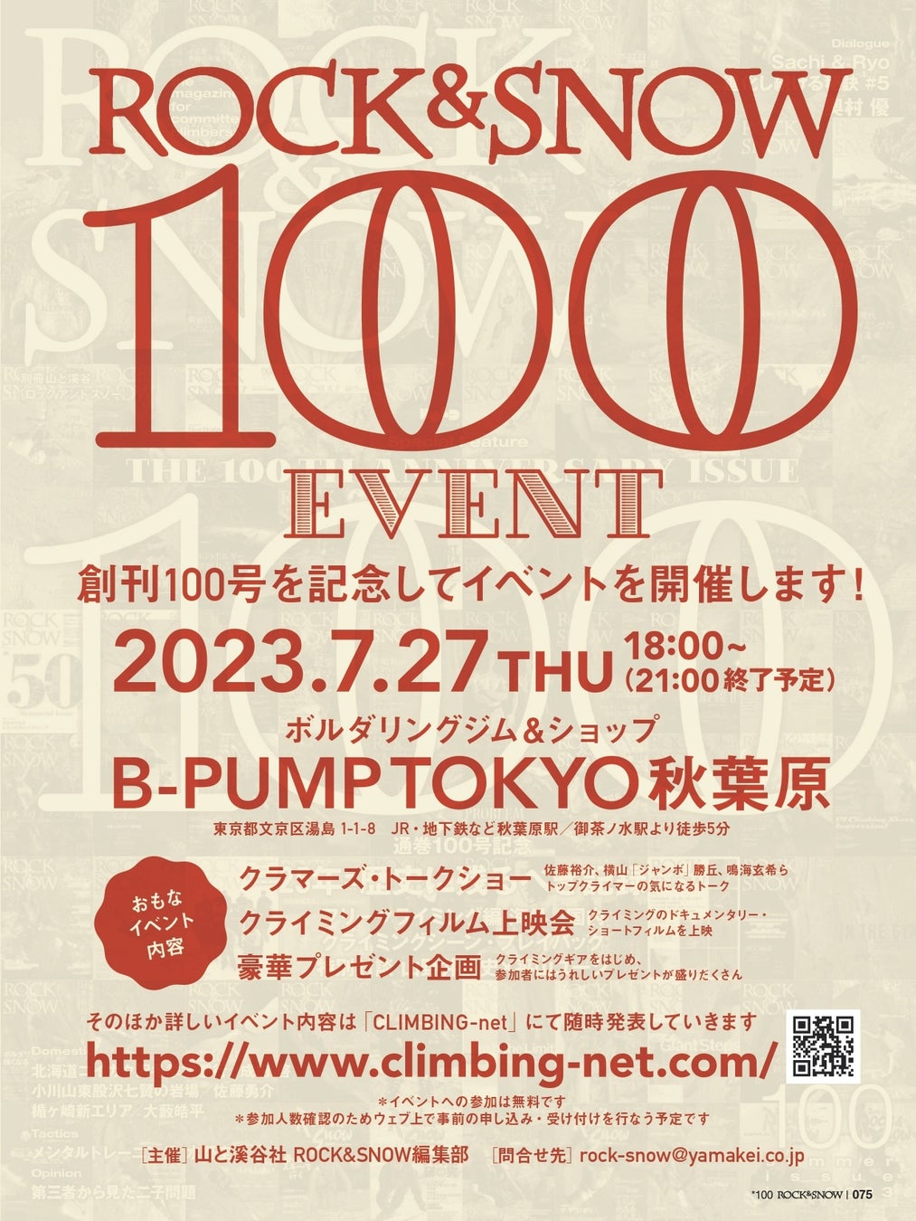 この夏、創刊100号記念イベントを、クライミングジムB-PUMP TOKYO秋葉原で開催します。