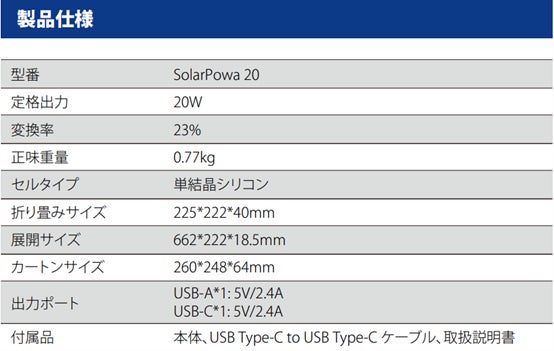 携帯型のソーラーパネルでは最大出力が5V、10Vのものが多いですが、BigBlue SP20